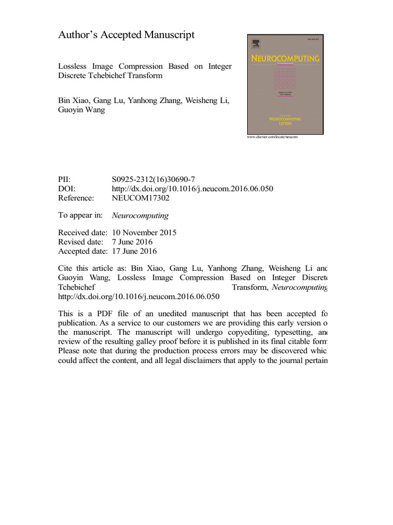 Keywords: Discrete Tchebichef Transform; discrete cosine transform; lossless image compression;
