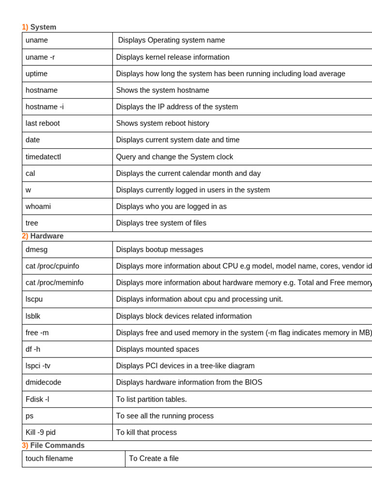 cat /proc/meminfo Displays more information about hardware memory e.g. Total and Free memory