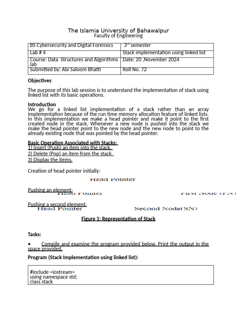 Lab # 4 Stack implementation using linked list