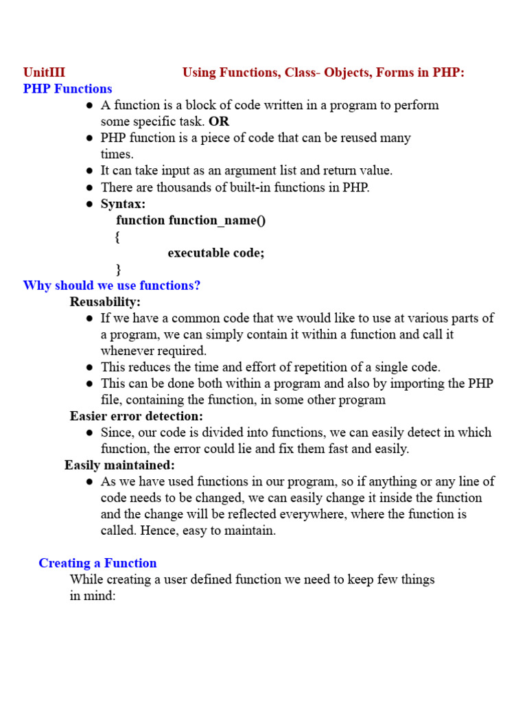 UnitIII Using Functions, Class- Objects, Forms in PHP: