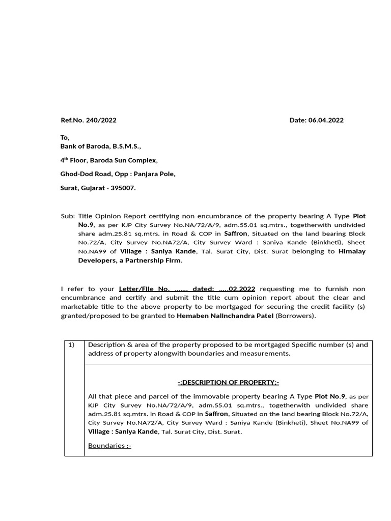 Sub: Title Opinion Report certifying non encumbrance of the property bearing A Type Plot