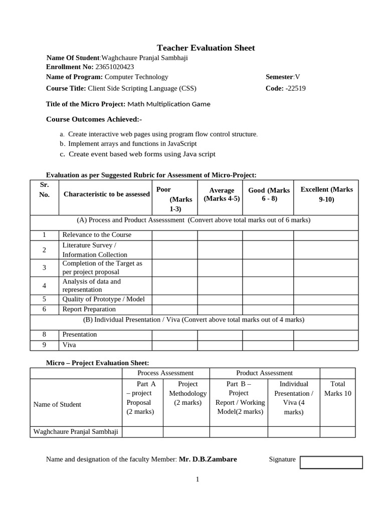 Micro – Project Evaluation Sheet: