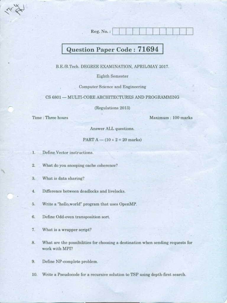 This document is a question paper for the B.E/B.Tech degree examination in Computer Science and Engineering, specifically for the course on Multi-Core Architectures and Programming. It includes various questions divided into two parts, covering topics such as vector instructions, cache coherence, parallel programming, and MPI. The exam is structured to assess knowledge through definitions, programming tasks, and detailed explanations of concepts related to multi-core systems.