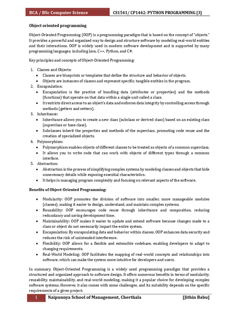 • Modularity: OOP promotes the division of software into smaller, more manageable modules