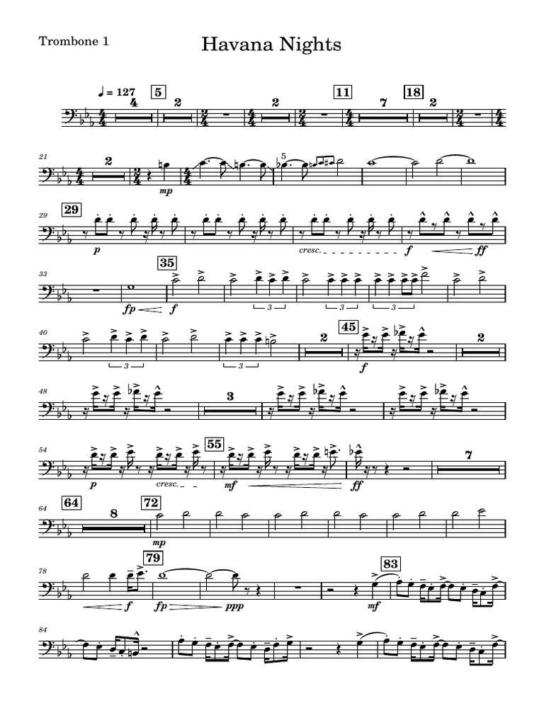 这是《哈瓦那之夜》的低音号乐谱,包含了多个乐段和指示。乐谱中有节奏、音符和动态标记,适用于低音号演奏者。文档详细记录了乐曲的结构和演奏要求。