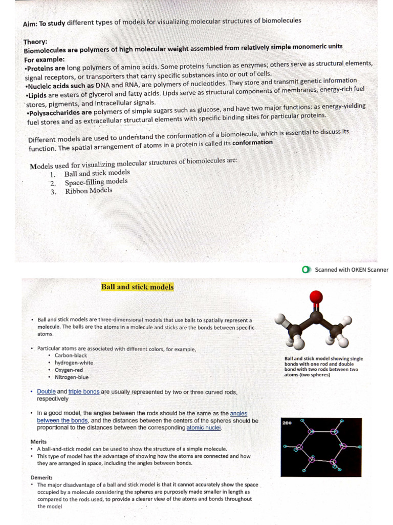 Aim: To study different types of models for visualizing molecular structures of biomolecules Theory: Biomolecules are polymers of high molecular weight assembled from rel For example: Proteins are long polymers of amino acids. Some proteins function as enzymes; others serve as structural elements, signal receptors, or transporters that carry specific substances into or out of cells. tNucleic acids such as DNA and RNA, are polymers of nucleotides. They store and transmit genetic information ‘Lipids are esters of glycerol and fatty acid. Lipds serve as structural components of membranes, energyrich fuel stores, pigments, and intracellular signals. ‘Polysaccharides are polymers of simple sugars such 2s glucose, and have two majo functions: as energy yielding fuel stores and as extracellular structural elements with specific binding sites for particular proteins: ly simple monomeric units bifferent models are used to understand the conformation ofa biomolecule, which Is essential fo discuss its function. The spatial arrangement of atoms in a protein is called its conformation “Models used for visualizing molecular structures of biomolecules are: 1. Ball and stick models 2. Space-filling models 3. Ribbon Models © scanned with OKEN Scanner+ all and stick models are three-dimensional models that use balls to spatially represent a ‘molecule, The balls ae the atoms ina molecule and sticks are the bonds between specific atoms + articular atoms are associated with different color, for example, + Carbon-bl + hydrogen-white + Oxygen-red + ‘Nitrogen-blue * Double and triple bonds are usually represented by two or three curved rods. respectively + Ina good model, the angles between the rods should be the same as the angles between the bonds, and the distances between the centers of the spheres should be proportional o the distances between the corresponding atomic nucle Merits ‘A ball-and-stick model can be used to show the structure ofa simple molecule. + This type of model has the advantage of showing how the atoms are connected and how they are arranged in space, including the angles between bonds. Demerit: *+ The major disadvantage of a ball and stick model is that it cannot accurately show the space ‘occupied by a molecule considering the spheres are purposely made smaller in length as. compared to the rods used, to provide a clearer view ofthe atoms and bonds throughout the model oO Ball and stick model showing single bonds with one rad and double, Bond with two rod atoms (wo spheres) © scanned with OKEN ScannerSimilar tothe ball and stick model, the space-filling model is also a method of spatially slsplaying a molecule and its characteristics + Aspace-flling model, also known as a calotte model's a type of 30 molecular model where the atoms are represented by spheres whose rai are proportional to the radi of the atoms and whose center-to-center distances are proportional to the distances between the atomic nuclei, alin the same scale. ‘Spheres ofciferent colors usually represent atoms of different chemical elements Space-flling calotte models ae also referred to as CPK models after the chemists Robert Corey, Linus Pauling, and Walter Koltun, who developed the modeling concept into a useful form, ‘They are distinguished from other 30 representations, such as the balLand-stic, by the use of the fullsize" space-filling spheres forthe atoms, ‘The atoms in the model are color coded with black=carbon, redzoxygen, white=hydrogen, ‘and blue=nitrogen. 5 ‘Merit ‘They are useful for visualizing the effective shape and relative dimensions of a molecule, and (because of the rotatabilty) the shapes of the surface of the various conformers. ‘The main advantage is that it shows the overlap ofthe electron shells ofthe atoms. | Trree-demensional,space-fling model of i T agomplex molecule, THC, the ative Demerit ae agent in marjuana. (On the ather hand, these models mask the chemical bonds between the atoms and make it dificult to see the structure ofthe molecule that is obscured by the atoms nearest to the viewer in 2 particular pose. This has the disadvantage that tis no longer possible to see the, angles between bonds: ‘Space filing Ball and Stick aes loa aee © scanned with OKEN ScannerRibbon diagrams, are 3D schematic representalions of protein stucture and are one of the most common ‘mathods of protein depiction used today ‘Tho bon depicts the general course and organization of the protein backbone in 3D and serves as a Visual framework for hanging deals of the entire atomic structure, such as the balls forthe oxygen atoms attached to myoglobin's active site inthe adjacent figure. S Ribbon diagrams are generated by interpolating a smooth curve through the polypeptide backbone + acholoas are shown as cotled ribbons or hick tubes, + Bsttands as arrows, and non-tepetiive cols or loops as lias or thin tubes. ‘The direction of the polypepide chain le shown locally by the arrows and may be inaicated overall by @ colour ramp along the length of the rbon, Current molecular graphics programs: PyMOL, Molscript Ribbon diagram of myogiobin ‘bound to haem (sticks) and exygen ‘Secondary structure"? (Fed spheres) (208: MBO) otelces (yfncical spiral ibbens, wit bon plane approximately folovng plane of peptides ‘Arrows wih thickness, abou [Link] 3 hick as they are wi, showing crecion p-stvanes and twist ofthe stand om amino to carboxy end -sheels ae seen as uifled because neighboring srandstist in unison, cF t » Bestrand arrows a yo ribbon ofthe structure of hubby poten (2 1282) aS ‘smcohedloops the bbbyroten EDR: 1082) @ scanned with OKEN ScannerLIPIDS + Three ways to represent the two stereoisomers of glyceraldehyde + The stereoisomers of glyceraldehyde are mirror images of each other show the actual configuration of, molecules. By convention Giycorol and a triacylglycerol. The mixed ‘wiacylglycerol shown here has three diferent fatty acs attached tothe alycerol backbone + 