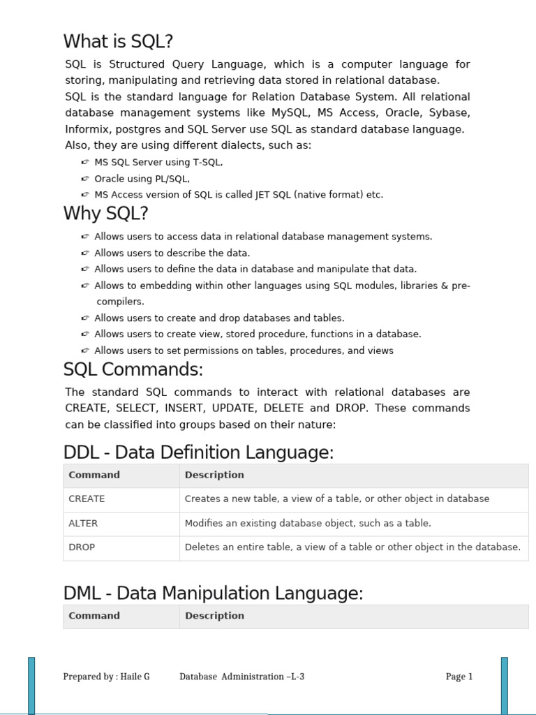 Prepared by : Haile G Database Administration –L-3 Page 1
