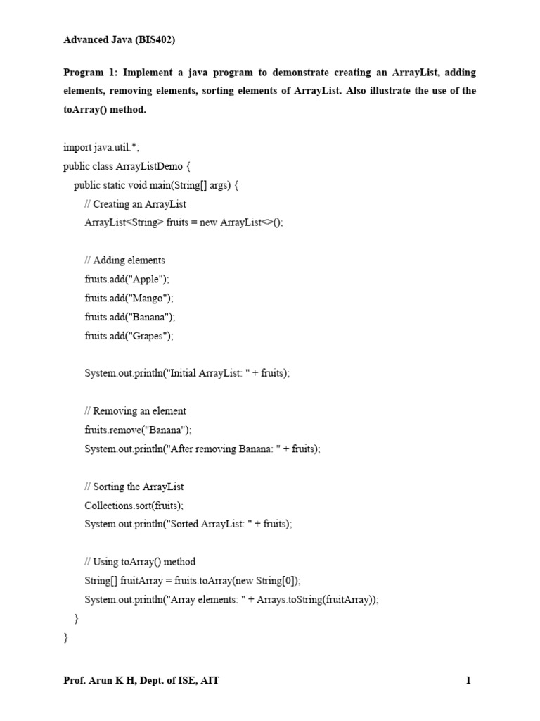 Program 1: Implement a java program to demonstrate creating an ArrayList, adding