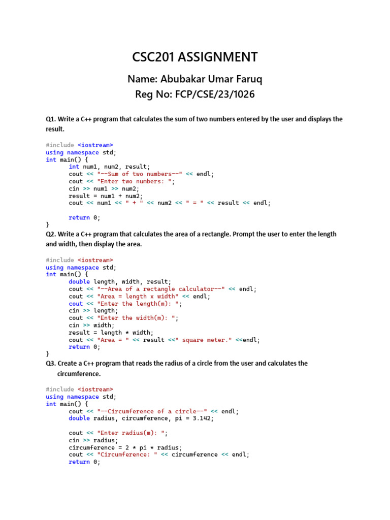 Q3. Create a C++ program that reads the radius of a circle from the user and calculates the
