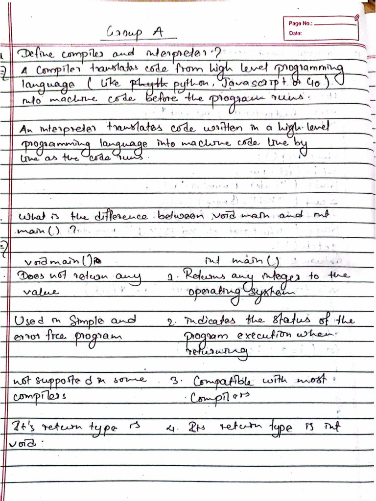 Paga No: Gaoup A ont [Define corn “ea ond ntorprelan 9 A Coropiler dravsiades code fem. Wi al pugreme a eer Cue q ‘ava goa rp + to ) mto mackre cade belne ‘ong Piogpaan VU + ger tt y Tl An mterprele? traurvlator ce urten ma Lig lore} papaces | Lanne Thte mache code Uva boy Tek Udlad & the difference belween eid anh Shieh moam(,) % ved mom (Jem DY mam () || Dees KF] Velen ane Q: Rela eeleaea fo value kod opnala ida tt Used _m Simple arc) gp. Mrdeatos He lauds of dle Herr free. Programs gia extatitn wher: Fd UDA DY \ [ust seppote dm ory Composite with rrobh § || com pi (or s “Ce pile? | ‘ Ides yeteun type ed 4. 2s veborn Tepe hy Te void - i]lee Qs ural rdontifier o / a ond itor Ode UL rqpae, vameg tal ore aw vod to __ variables, Arucds+ funclim aud 6h» witien + Te Tove ered to weirquelly Tauhify the ertiby usin thes "2 rw : 7 Qa wat are tHe feature of O- Programm QTM, featusos BP C-progiares { 2 Ore, 4: Srenple ane efMeionwt “a { 2 fet 31 function Riel Libra riod 4 | Dywante wearor 5 May aghast ——“AOL PPT EL PO 29 YI! 4x9) | Md-ox9 aco COT) purngmep|| - bt uel ie # Go t oeenb-o| var dud To oH | bw TREAT foqy bpedad per aH PapwoT wl vdre7 +E broised © Pacapep a sdpoy te] tt OS HVWMO| pro oroudda “pa 24 “OO IP BOIWMa| 2G PMOMF all “S VOI GPM PTO F ePoIOTD + A OPOoO™TO) Popo woqunn envy wo IP Pemve arom Aiwa wl has oy : Bo pe TT P TO OE rap eropo 1 para PUPP 47, "oS “Av aoS5 wpm WBE Ooo] avo? wWddN | ~PEL wabeq oe WpPocoyo OOM] PAY DES aapPrepl ™ YE Ee = baq pamky vie i PTY POP [a - ro FH YO 51 ADs YOM} Ive) AIO! aeAPAMUYY | ASpORKO~N ¢ PIM PME’ epsoen ou fep Of CoraweU foods aye NG Por wson ayoeds ero Ppewreh omaew copABOd Y Prmiopard oro sexgals iH PePE piacrhoy IL (= “ teyprepy pyro praoiltey oven Op prery nD a “dno—Tr Fade? poh ee el [ere tu Fey | Te [rs PTO Tutu BMWFo1wen aropaw /- GH aah a repre paar ~T0 prada oy eco je hy oa BPM Vi ag -7 9dag aE Fade, 71g dOR wr Of ye where Pro Gm PO T™ = ppy | by PY Gun PO TMM venom Peay reg + & day “MS PTO Geinw “UM MNO KON sepa, R @ dap ww OR “ owe Re; PHP? wI4F~™ GM} OF PRY OF aap DO} QO o—\_. =) er orboid va rq pero fo MIOXG raga may ems OF eoororbos Sem pPOAL PRUPOP PoR_ fas PH Vey + 3] 0700 "HOLME VPM pOTPIMI)} Pro capnabpo PUED ea, + 09 beg———__—~ Page No. ——____| Data: ~S9] What wae dearom omlrs| Malament 2 Write vege | do nd gnealest number aos Gots any different wt numbers. - Deawm wohol statements m C | @ sacha nested if aud if-else are used Jo. execle 4 ceslam noup ob slalements if the specified tondiliews ove met. QR the wndilime are abt med feo olse post f ‘|e thotement will wt bo executed BP. | » 3 Tere we 3 2m lupo cf doohivn cmlél statement: Tere Mrdlude’! 2 a} Neetod Hf tatowenti Bf-elce statarens Ee adores - [te mclude