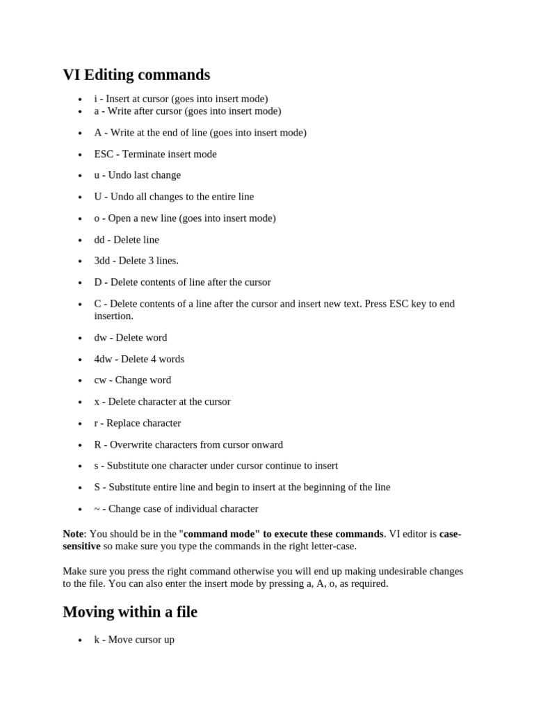 Note: You should be in the "command mode" to execute these commands. VI editor is case-