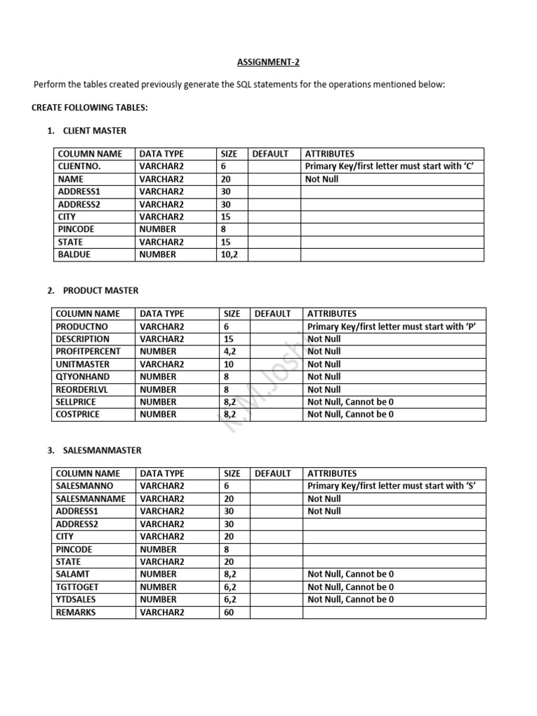 SALESMANNO VARCHAR2 6 Primary Key/first letter must start with ‘S’