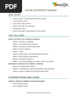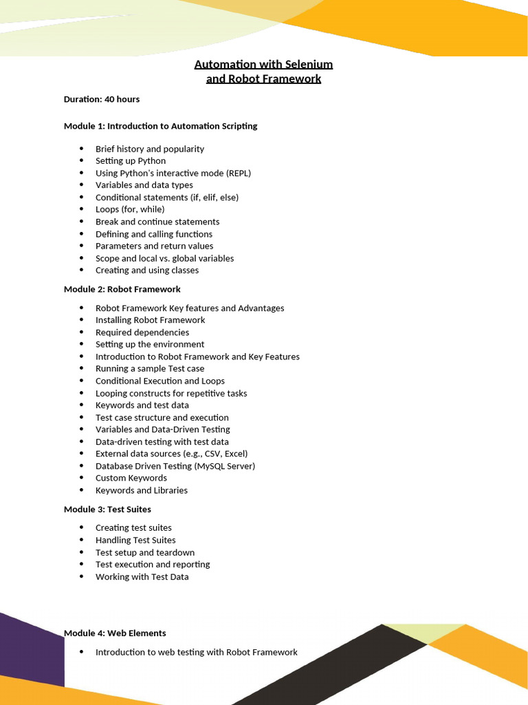 The document outlines a 40-hour course on automation using Selenium and Robot Framework, divided into five modules. Topics include Python basics, Robot Framework features, test suite management, web element interactions, and API testing techniques. The course emphasizes hands-on experience with tools and methodologies for effective automation scripting and testing.