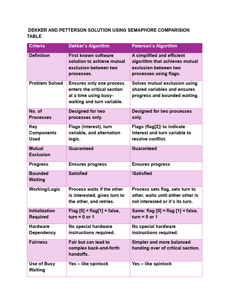 Criteria Dekker’s Algorithm Peterson’s Algorithm