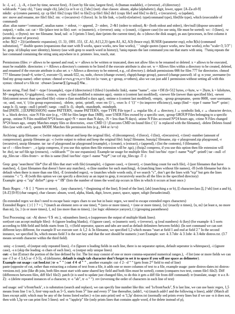(words), -c (bytes). tee: tee filename. head, tail: -n 5 (prints 5 line), date (prints the current time), du -s (shows the disk usage), ps aux (processes, in first column it