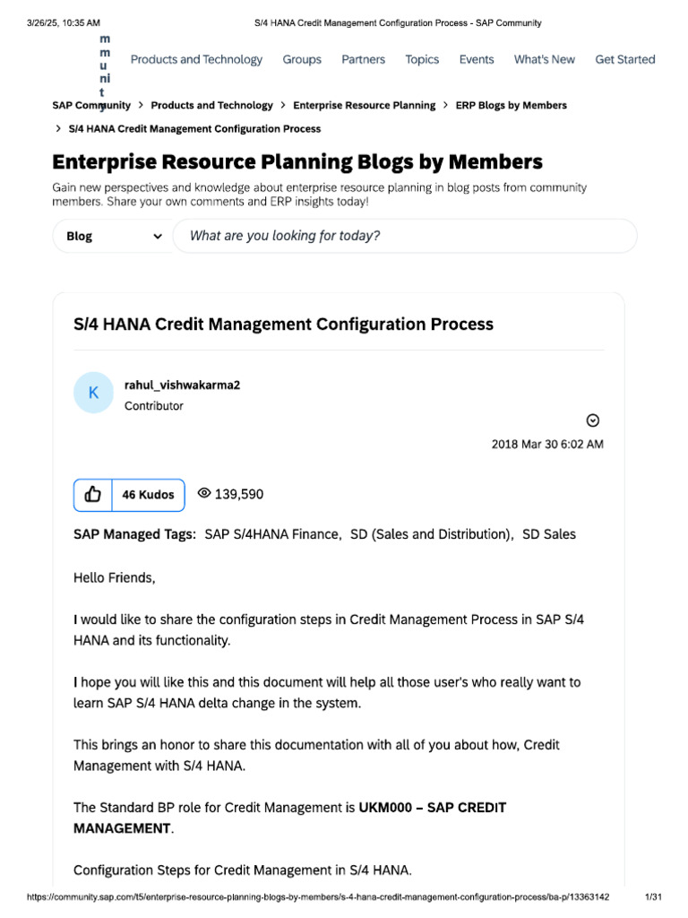 mn products and Technology Groups Partners Tops Events Whats New Get Started ni ‘ SAP Community > Product and Technology > Enterprise Resource Planing > ERP Blogs by Members > Sid HANA Credit Management Configuration Process Enterprise Resource Planning Blogs by Members Gain new perspectives and knowledge about enterprise resource planning in blog posts from community members. Share your own comments and ERP insights today! Blog ¥ What are you looking for today? S/4 HANA Credit Management Configuration Process __tahul_vishwakarmaz Contributor °° 2018 Mar 30 6:02 AM 46 Kudos | © 139,590 ‘SAP Managed Tags: SAP S/4HANA Finance, SD (Sales and Distribution), SD Sales Hello Friends, I would like to share the configuration steps in Credit Management Process in SAP S/4 HANA and its functionality. Thope you will like this and this document will help all those user's who really want to learn SAP S/4 HANA delta change in the system. This brings an honor to share this documentation with all of you about how, Credit Management with S/4 HANA, The Standard BP role for Credit Management is UKM000 - SAP CREDIT MANAGEMENT. Configuration Steps for Credit Management in S/4 HANA. titps/leommunity [Link]-resource-planning-biogs-by-mombersi-4-hana-cret-management-coniguraton-procassiba-p/13365142 31‘3205, 10:25AM ‘514 HANA Cred Management Confguraton Process ~ SAP Community Step 1: Define Credit Segment Path: [2] sana positon easing 8c sats Releasanctes ChangeLog inere=ts structure Actitionel intarmetion > fR__Cross.Apalication Comaonents > BAR Portfolio and Projact Management > Financial Accounting (Mew) Y—\ Fanci Suppsy Chin Management o > Biles rect o > Biling Consotiton o > Cash and Liquidity Management > Collections Management v \cresit wanagement wi VY Credic Rise Monitoring v Master Data vi © Greate Creat segments FIN_CR_CREDIT_SGM| New Entries, Newentres [Link]., Delete Undo Change Previous Entry New Credit Segment 2CSTATA SAP Crecit Management Segment Data Name Currency “Bach. Rete Tse |v) Add, Conbibuiion ta Main Credit Segment -ntps:i/[Link]-tesource-planning-blogs-by-memberis-4-hana-credit-management-configuator-processibapit3363182 2/313128/25, 10:95 AM Save it, |SM4 HANA Crack Management Confguration Process - SAP Community Only if Needed: Note of External Credit Information, you need to create Rating Procedure, Make sure that the external information providers are connected to the following interface via the XI infrastructure: Credit information Query out (Query Credit Information from External Data Providers) in the namespace [Link] (cross-Applcation Companents SAP Portfolio and Projact Management Financial Acceunting (New) ‘Action tormaton Path: structure >a New Entries, Financial Supply Chain blanagement cler Direct Billag Consolation Cash and Liquidty Management Collections Management Credit wenagement (Create tek Mantonng Master Data © Create Cresit Seuments| Define Rating Procedure ete Customer Creat Greup bbetne Fermulas Create Rule fr Searing and Creed Lim Calculation © Create Risk Classes 5 Detine Attributes Disalay Integration of External Crest Information FIN_OR_CREDIT_SGM FIN_OR RATING PR, Fi CUST_GRP Fino FORMULAS FIN_OR_LIMIT_RULE FIN_OR RISK CLASS ‘o_UKM_ATTREOF V_UKM_EXTAG_INT titpsvleommunity sap [Link]-processiba-p/13369142 31313128125, 10:36 AM ‘5/4 HANA Credit Management Configuration Process - SAP Commurity \ | Newenoies Copyas.. Delete Ucn Crange Select Select Block Deselect Dialog Structure etna Proceoure OOREDS © Coating Prceoure Resus of Rat Results of Ratings © estng Franke Name (Language nepend. Name (Lanqusne-Specttc) aa BD veryLow ‘Very Low Default ise oe 2 Low Low Default se ols 3 Moderate Meaiu Deraut Rsk b 4 ton High Derout sc ole 5 Net Rates No Evaiuates This rating procedure, you need to assign with credit limit calculation, | Movenves CopyAS.. Coste Unsochange SecA SaxctBEck OaseeciAl —@ Diay Nee BieaSetet corte, Flor Seer nd Cred Lit Ceatien ~ 9 det Stomn es Coat ose rues None rast acreotume ATT ecnee Rete ew Baier cuss * ue ermagain c Select the created rule and click on score, credit limit and rating procedure. ee eeFants emis tore one Sestune ras arrnevtunecumews sone ee Ssueronrm cites 8 g [Smarr Seen ‘ntps:i/[Link]/Slontorpise-tsource-planning-blogs-by-membersis-4-hana-cred-management-confguraior-process/ba-p/13363142 ais3128125, 10:36 AM ‘5/4 HANA Credit Management Configuration Process - SAP Commurity ~ Dokdo sony wacetuat . Dew [rararocarstcn | geatte.| Geainiram._ Fomunkane ‘atdt) Ta) Moteur Unt © mm Qistuntcrenesct ee Serstune paroPrcaareSector I ID Type = Credisafe. Step 2: Define Customer Credit Group [| Newentries Copyas.. Delete | Customer Credit Group Credit Group Name of Credit Group - Small / Medium Customers Subsidiaries Note: In SAP S/4 HANA, the Credit Management Calculation has enhanced with formula editor function button. Following are the calculation formula criteria: 1. Currency ‘ntps:i/[Link]-tesource-planning-blogs-by-memberss-4-hana-credit-management-configurator-processiba-pl13363142 5/31‘3205, 10:25AM ‘514 HANA Cred Management Confguraton Process ~ SAP Community 2. Credit Segment 3. Score ‘change Diplay NewEniner CanyAs..Onkte UndaCange Select Al SeectBlork Oesclest ‘SAP Creat Management Formulas rar Fonte etn ontr ne crete cna {patctaton of cade Line ner ne creat int Ps Cites caeuaten of credit Unit Sete Seer rons Cusine Cleat of Scare SHER sur Pha cise silalarioret sere ‘Step 3: Assign Credit Control Area and Credit Segment. Transaction Code: UKM_SEGMENT Path: sructure ‘Acational intonation > ‘SAP Pomtola ana Project Management Oo} > Financial Aceaunting (New) ¥ © Financial Supply Chain Management Eller Direct Eling Consolidation (Cash and Liquoty Management Calleesors Management ‘Creait Management > ‘Creat Risk tantoring \ Integration with Accounts Recsivable Arcounting and Sales and Dist > Integravon wit Acenunts Reeaivable aecourting y Integration wih Sales and Disbis