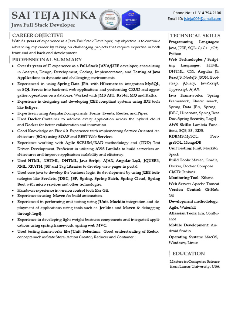 SAI TEJA JINKA Phone No: +1 314 794 2106