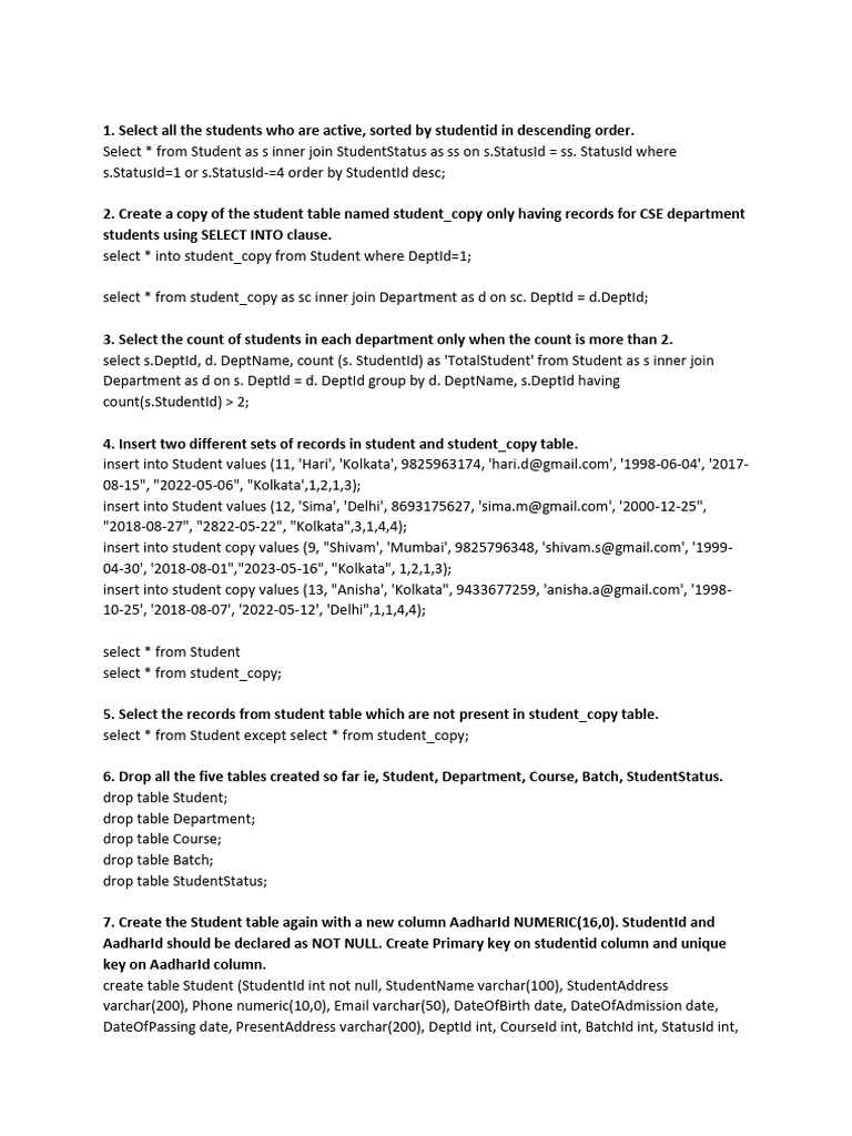6. Drop all the five tables created so far ie, Student, Department, Course, Batch, StudentStatus.