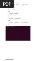if [ $# -ne 3 ] then echo "$0: number1 number2 number3 are not given" >&2 exit 1 fi n1=$1 n2=$2 n3=$3 if [ $n1 -gt $n2 ] && [ $n1 -gt $n3 ] then echo "$n1 is Bigest number" elif [ $n2 -gt $n1 ] && [ $n2 -gt $n3 ] then echo "$n2 is Bigest number" elif [ $n3 -gt $n1 ] && [ $n3 -gt $n2 ] then echo "$n3 is Bigest number" elif [ $1 -eq $2 ] && [ $1 -eq $3 ] && [ $2 -eq $3 ] then echo "All the three numbers are equal" else echo "I can not figure out which number is biger" fi