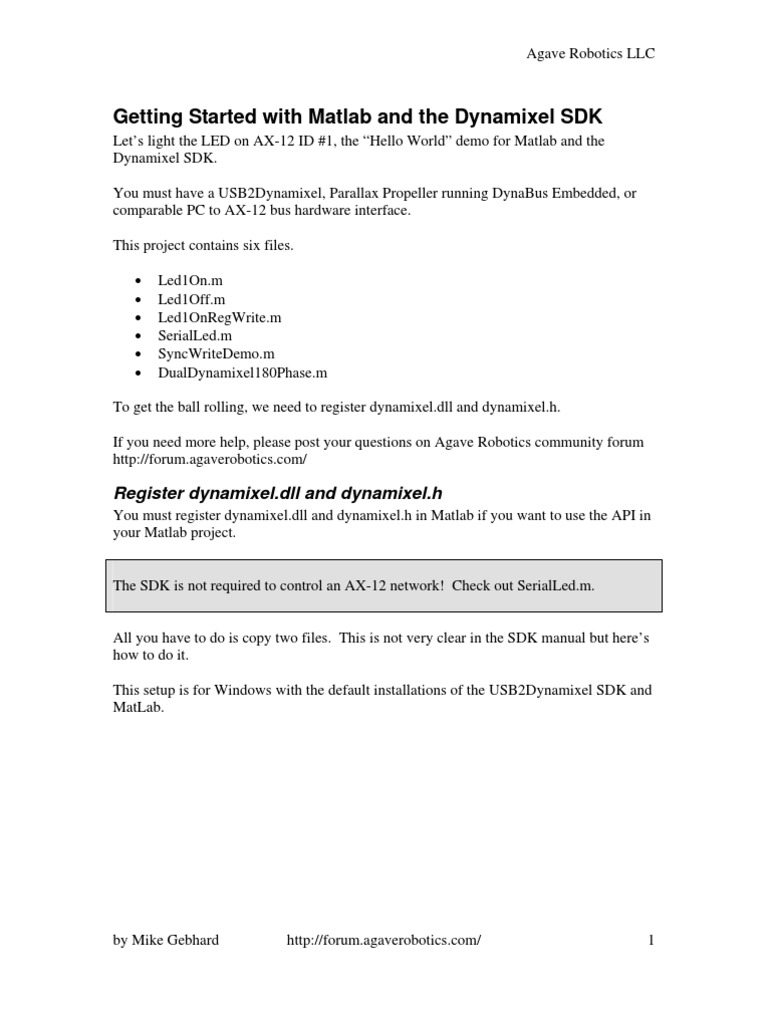 Lets light the LED on AX-12 ID #1, the Hello World demo for Matlab and the Dynamixel SDK. You must have a USB2Dynamixel, Parallax Propeller running DynaBus Embedded, or comparable PC to AX-12 bus hardware interface. This project contains six files. Led1On.m Led1Off.m Led1OnRegWrite.m SerialLed.m SyncWriteDemo.m DualDynamixel180Phase.m