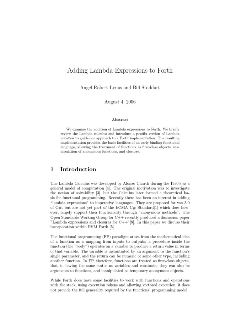 The Lambda Calculus was developed by Alonzo Church during the 1930s as a general model of computation [4]. The original motivation was to investigate the notion of solvability [3], but the Calculus later formed a theoretical basis for functional programming. Recently there has been an interest in adding lambda expressions to imperative languages. They are proposed for vsn 3.0 of C#, but are not yet part of the ECMA C# Standard[1] which does however, largely support their functionality through anonymous methods. The Open Standards Working Group for C++ recently produced a discussion paper Lambda expressions and closures for C++[8]. In this paper we discuss their incorporation within RVM Forth [5]. The functional programming (FP) paradigm arises from the mathematical idea of a function as a mapping from inputs to outputs; a procedure inside the function (the body) operates on a variable to produce a return value in terms of that variable. The variable is instantiated by an argument to the functions single parameter, and the return can be numeric or some other type, including another function. In FP, therefore, functions are treated as rst-class objects, that is, having the same status as variables and constants; they can also be arguments to functions, and manipulated as temporary anonymous objects. While Forth does have some facilities to work with functions and operations with the stack, using execution tokens and allowing vectored execution, it does not provide the full generality required by the functional programming model.