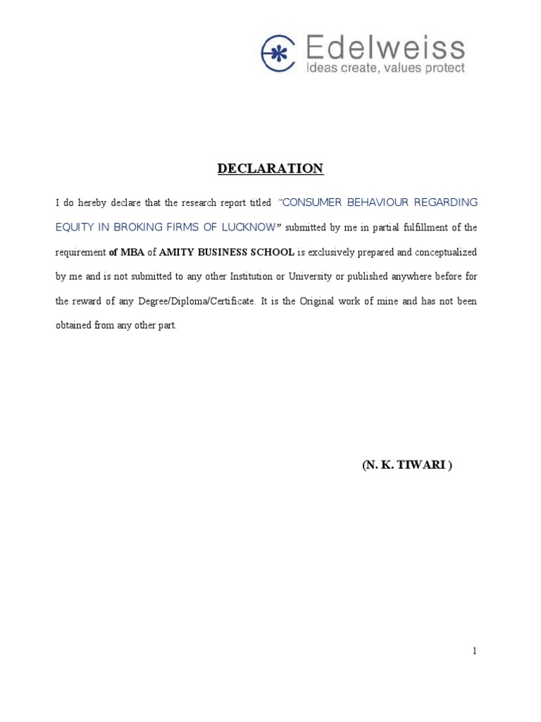 I do hereby declare that the research report titled CONSUMER BEHAVIOUR REGARDING EQUITY IN BROKING FIRMS OF LUCKNOW submitted by me in partial fulfillment of the requirement of MBA of AMITY BUSINESS SCHOOL is exclusively prepared and conceptualized by me and is not submitted to any other Institution or University or published anywhere before for the reward of any Degree/Diploma/Certificate. It is the Original work of mine and has not been obtained from any other part.