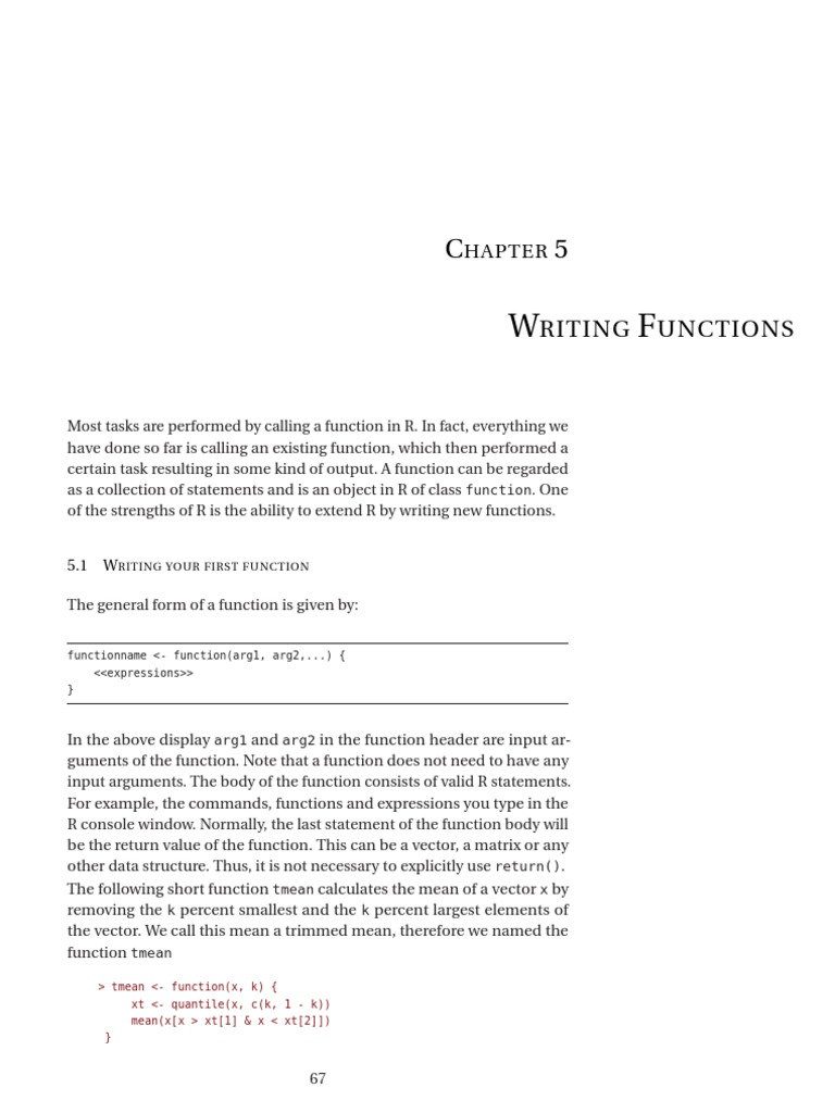 Viewing function code Writing large functions in R can be difcult for novice users. You may wonder where and how to begin, how to check input parameters or how to use loop structures. Fortunately, the code of many functions can be viewed directly. For example, just type the name of a function without brackets in the console window and you will get the code. Dont be intimidated by the (lengthy) code. Learn from it, by trying to read line by line and looking at the help of the functions that you dont know yet. Some functions call internal functions or pre-compiled code, which can be recognized by calls such as: .C, .Internal or .Call. 5.2 ARGUMENTS AND VARIABLES