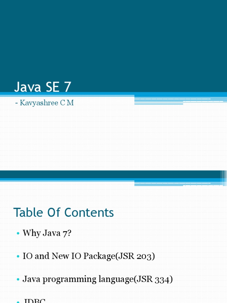 Why Java 7? IO and New IO Package(JSR 203) Java programming language(JSR 334) JDBC