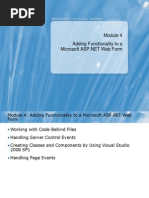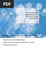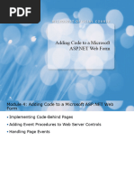 Module 5: Adding Code to a MS ASP.NET Web Form Youll learn about the various methods that can be used for adding code to your MS ASP.NET Web application Plus! youll learn about event procedures for Web server controls, how to use them, and the order which they work Then, learn how to use code-behind pages for adding code to Web pages