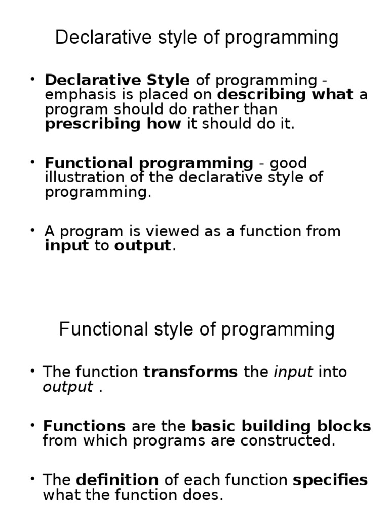 Declarative Style of programming emphasis is placed on describing what a
