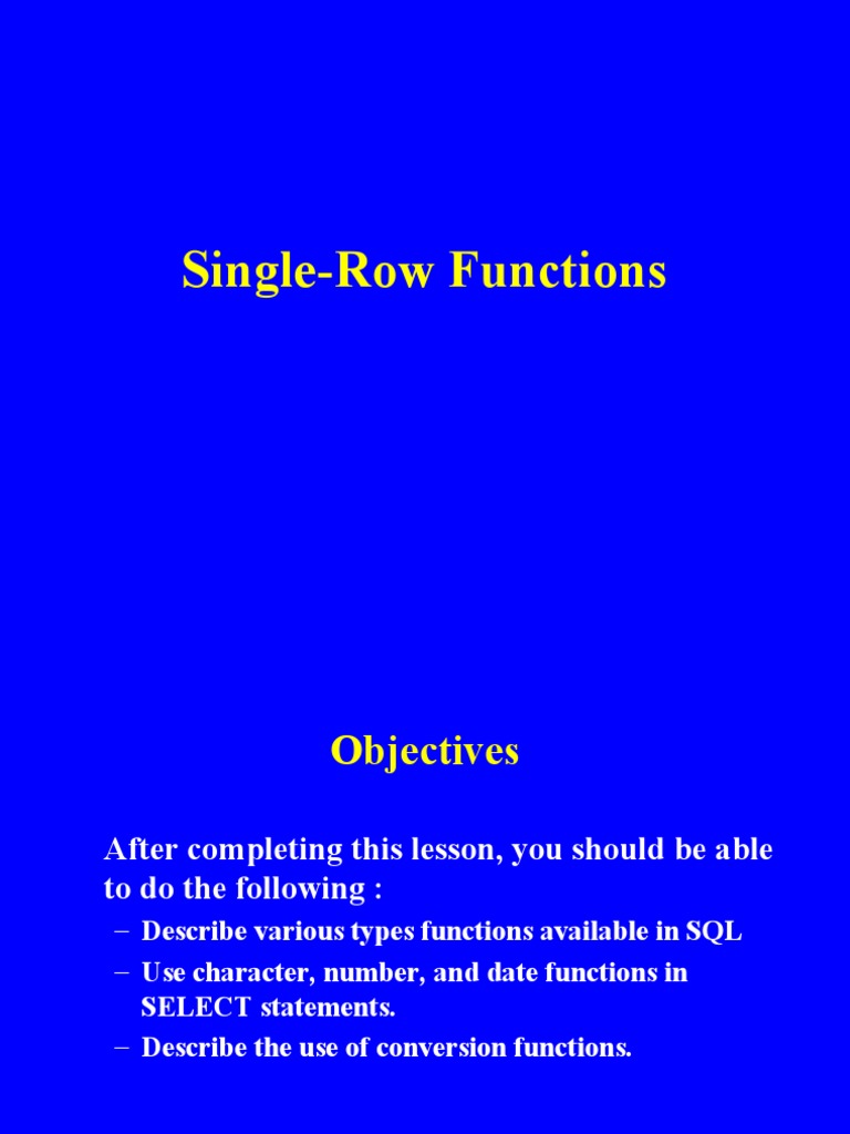 • TRUNC (‘25-JUL-95’, ‘YEAR’) -------> 01-JAN-95