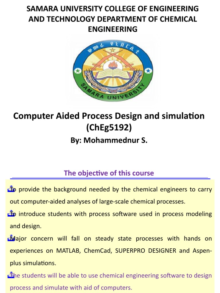 experiences on MATLAB, ChemCad, SUPERPRO DESIGNER and Aspen-