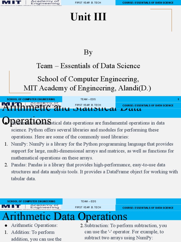 Arithmetic and Statistical Data FIRST YEAR B. TECH COURSE: ESSENTIALS OF DATA SCIENCE