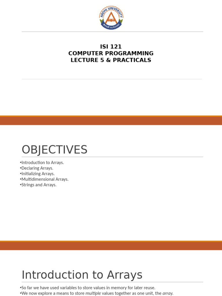 •To declare an integer array named arr of four elements, we write int arr[4];