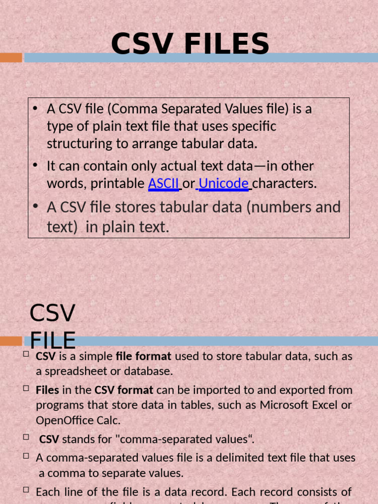 • CSV is easy to generate and import onto a spreadsheet or database.
