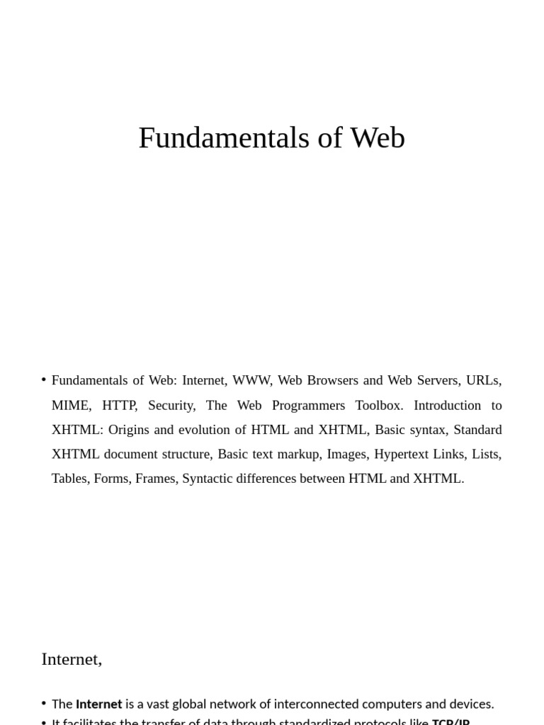 • Fundamentals of Web: Internet, WWW, Web Browsers and Web Servers, URLs,