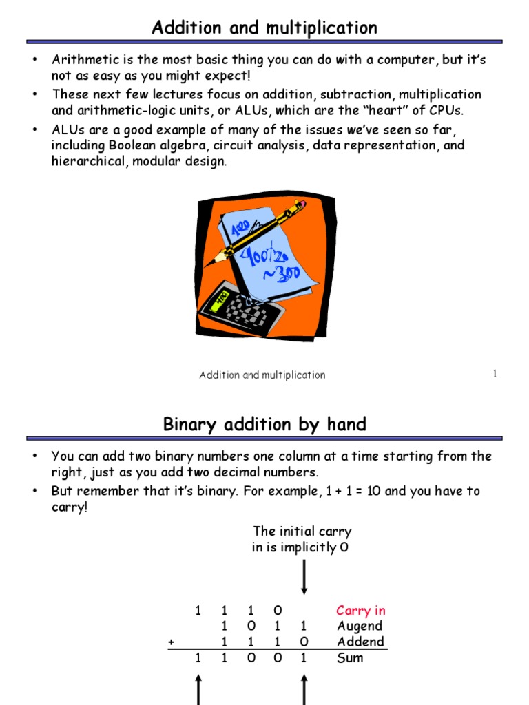 Arithmetic is the most basic thing you can do with a computer, but its not as easy as you might expect! These next few lectures focus on addition, subtraction, multiplication and arithmetic-logic units, or ALUs, which are the heart of CPUs. ALUs are a good example of many of the issues weve seen so far, including Boolean algebra, circuit analysis, data representation, and hierarchical, modular design.