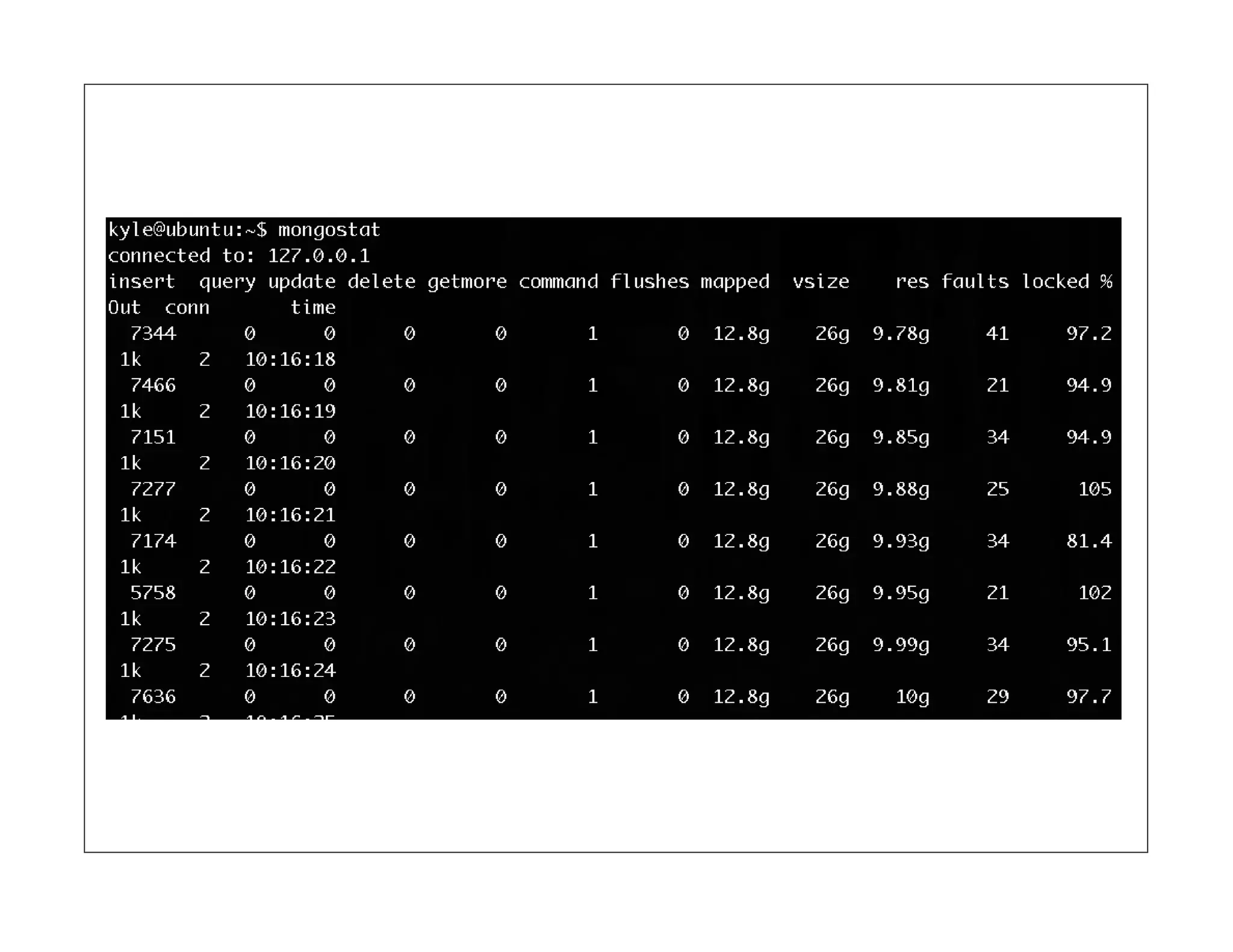 Here's how theyappear in the log: Sun May 22 19:01:47 [conn10] query docs.spreadsheets ntoreturn:100 reslen:510436 nscanned:19976 { username: "Minner, Cori" } nreturned:100 147ms