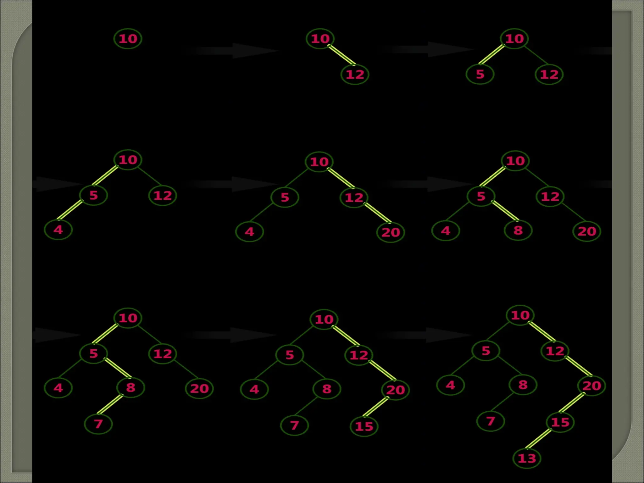 The document outlines the characteristics and operations of binary trees, including full and complete binary trees. It details the processes for searching, inserting, and deleting nodes within a binary search tree, providing step-by-step instructions for each operation. Additionally, it illustrates in-order, pre-order, and post-order tree traversals along with a sequence for constructing a binary search tree.