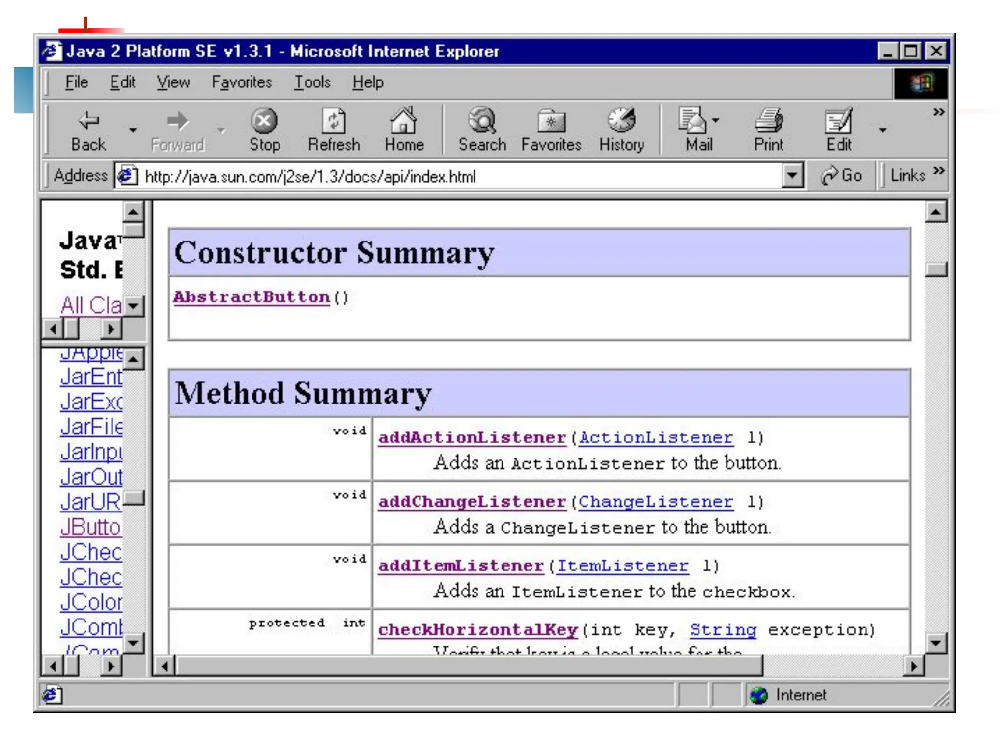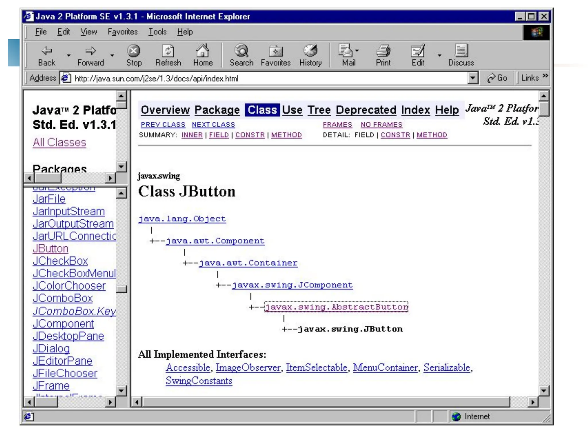 Description of Classes ■Object: All classes ultimately derive from Object, thus this class is at the top of the tree. ■ Component: represents an object that has a visual representation that can be shown on-screen and that can interact with users. This class defines some basic methods that are available to all Swing classes.