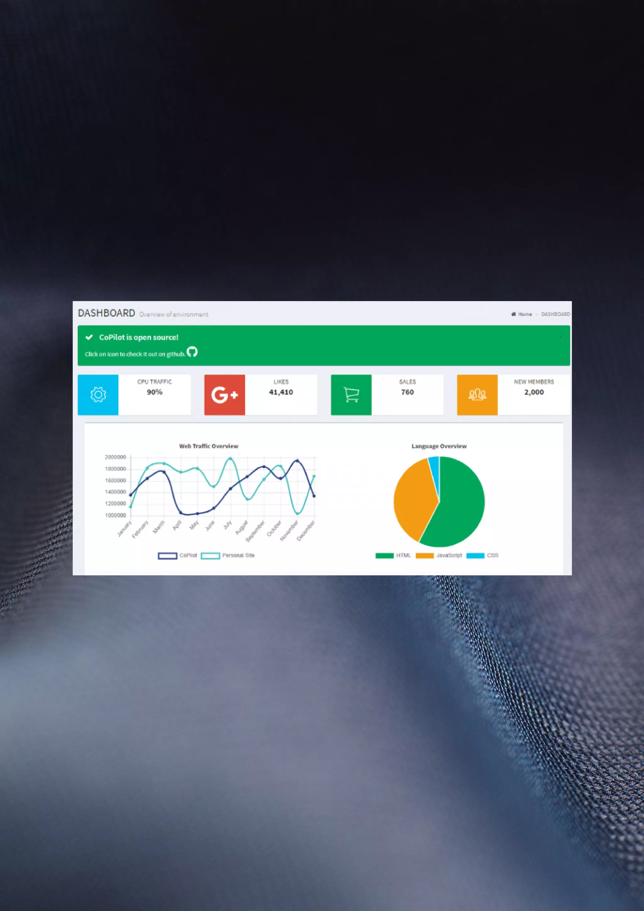 Copilot, a responsiveadmin dashboard template, is a fork of the AdminLTE. Bootstrap 3 forms the base of this project’s UI. It has a significant resolution that is compatible with small mobile screens to any desktop screen sizes. The Copilot project makes 25000 stars and 651 forks on GitHub. Official Website: https://copilot.mistergf.io/? ref=madewithvuejs.com GitHub Link: https://github.com/misterGF/CoPi lot 6. Copilot