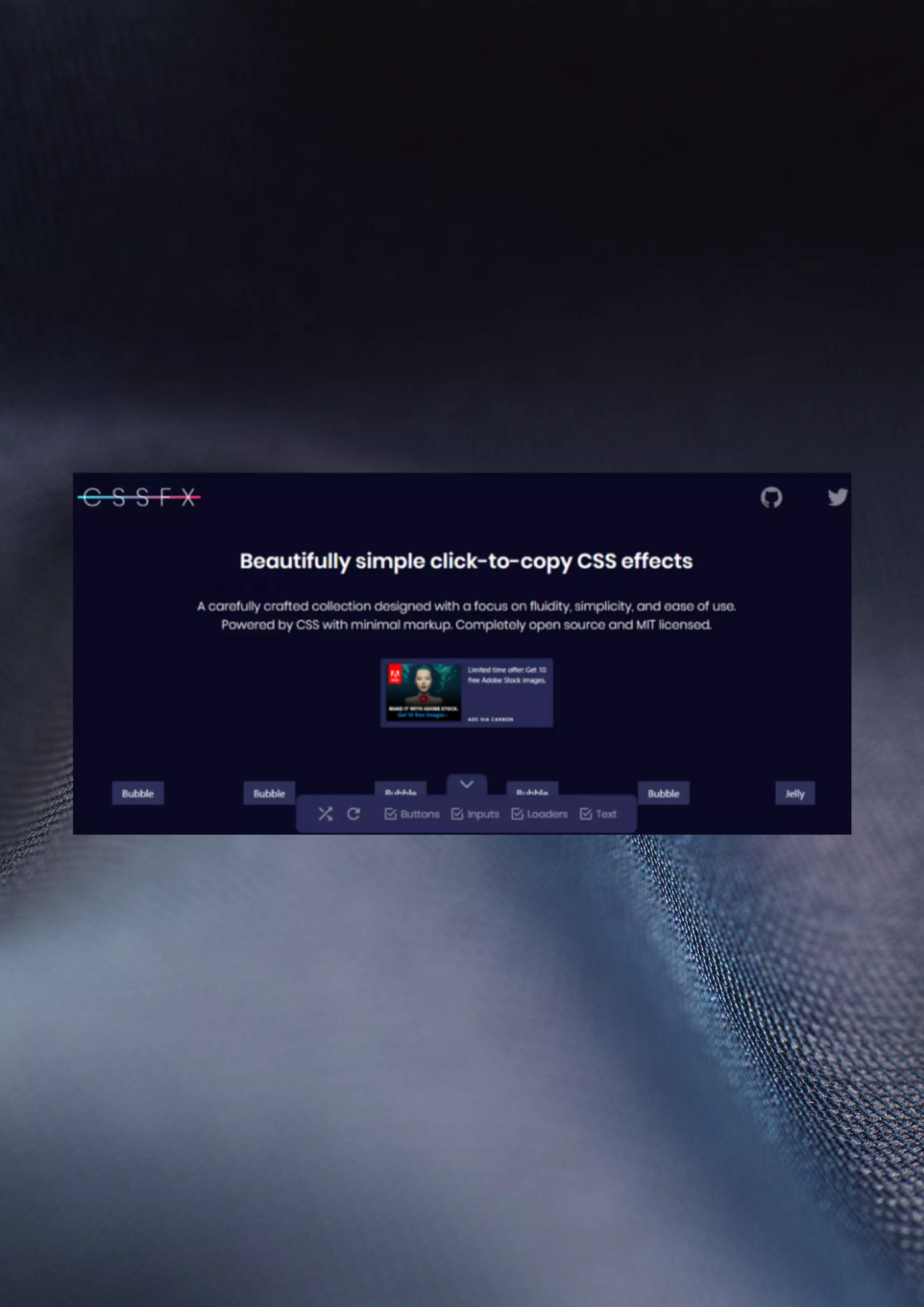 As the namesuggests, CSSFX is a collection of CSS effects that you can apply to your project on just clicking the effect. It is click-to-copy. You can check the preview of each CSS effect before you use it. GitHub has gathered 5.6k stars and 277 forks for this project. Official Website: https://cssfx.netlify.app/ GitHub Link: https://github.com/jolaleye/cssfx< /p> 17. CSSFX