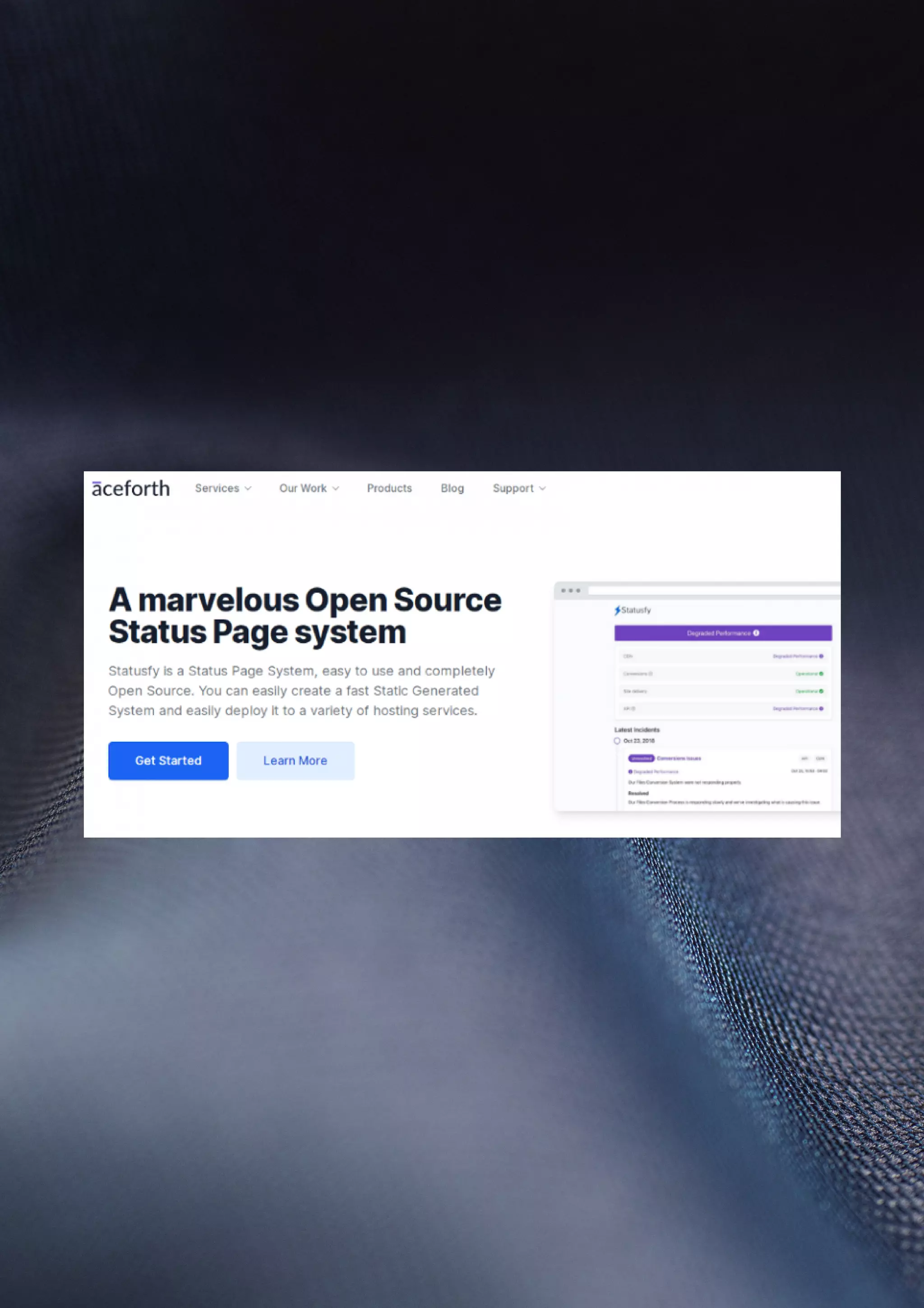 Vue.js, Nuxt.js, andTailwind CSS were used to make this status page system. It is a web application that can help you create your custom interface, abstraction, and theme. Stausfy has 1.9k stars and 128 forks on GitHub. Official Website: https://aceforth.com/products /statusfy GitHub Link: https://github.com/aceforth/statu sfy 18. Statusfy
