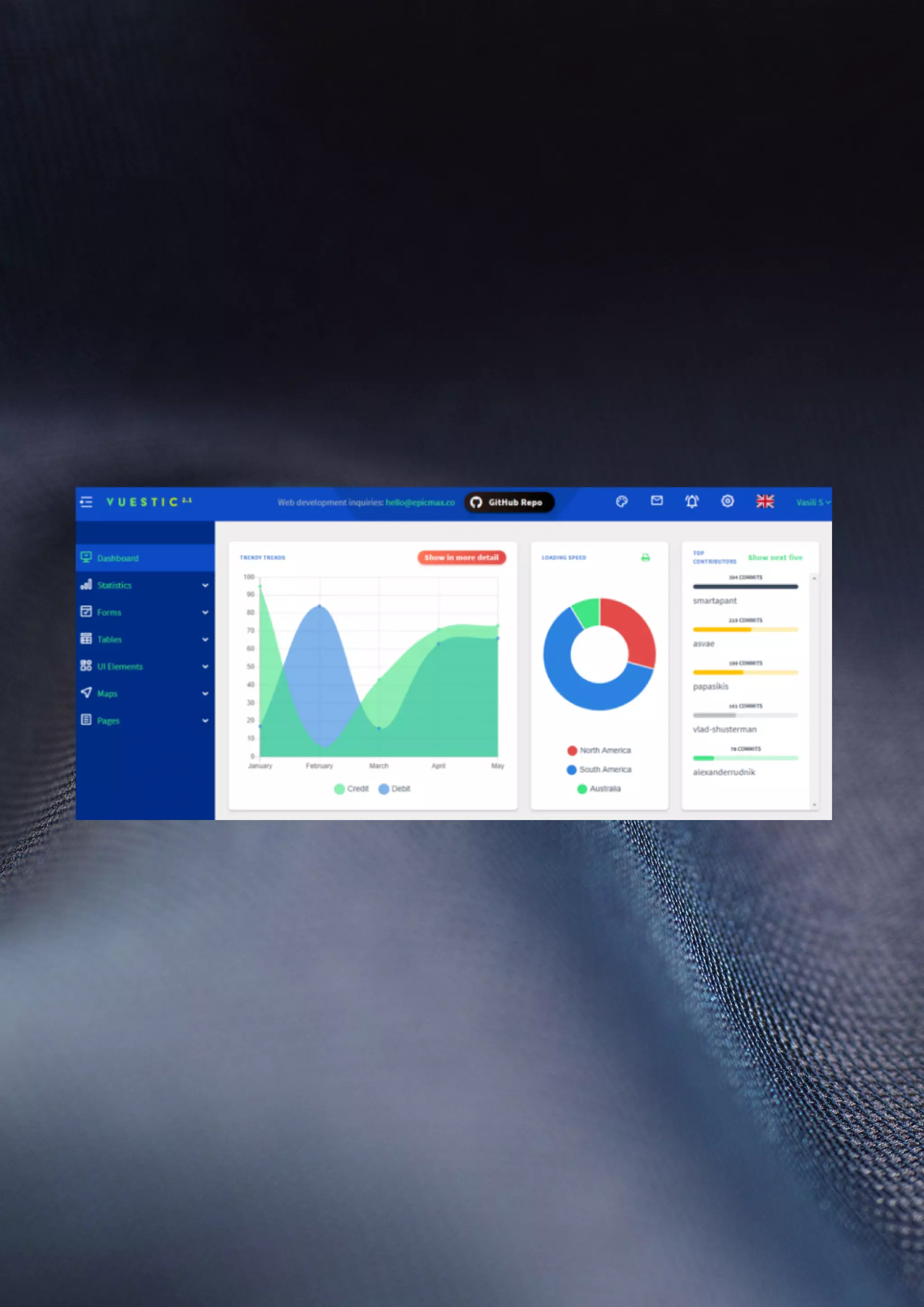 Vuestic is madeusing Bootstrap 4 and has 18 pages and 36 built-in UI elements for creating your responsive custom admin template. It has 7.2k stars 1.1k forks on GitHub. GitHub Link: https://github.com/epicmaxco/vu estic-admin 20. Vuestic