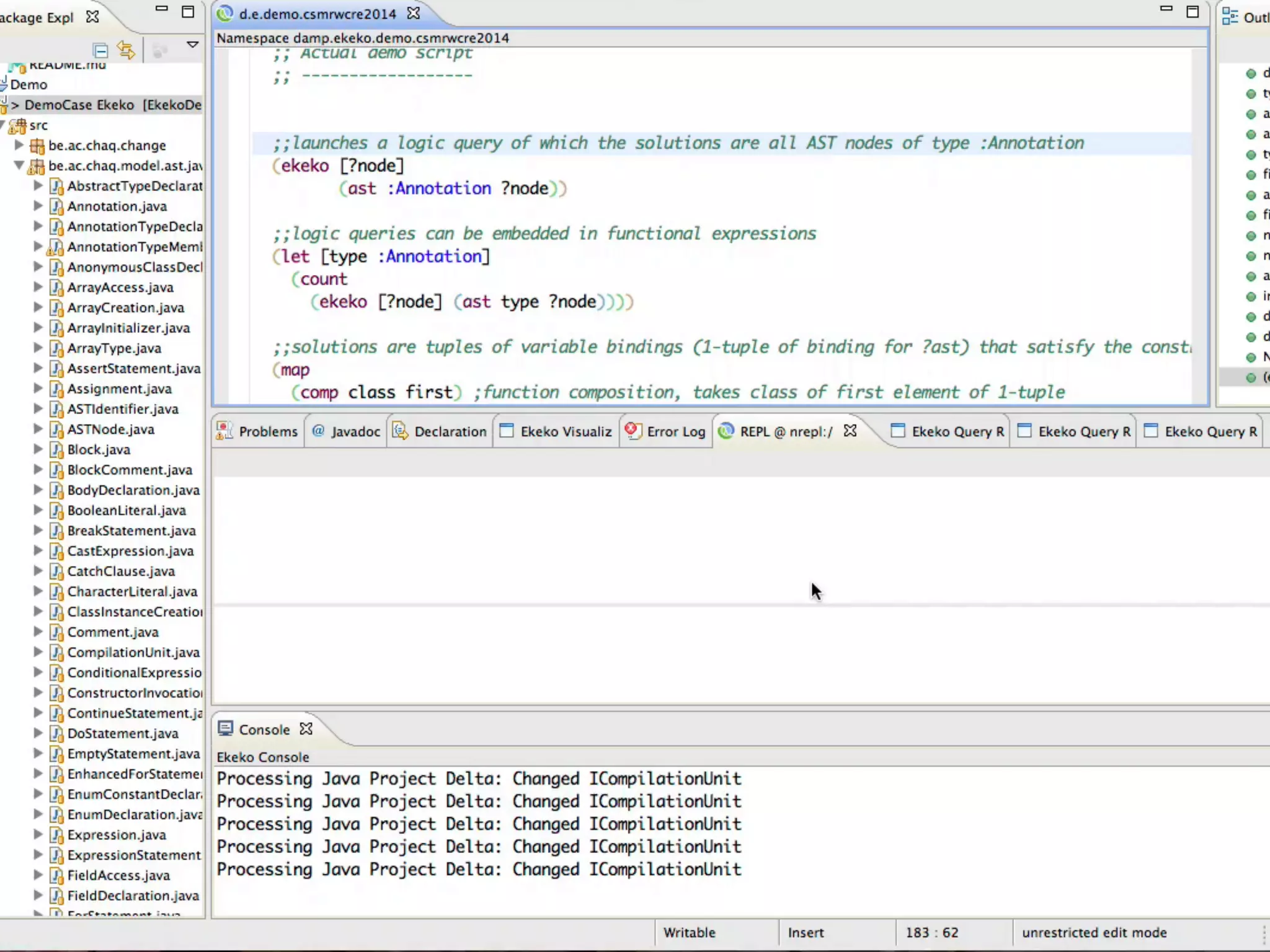 The document discusses the ekeko library, a Clojure library for applicative logic meta-programming within an Eclipse workspace, which facilitates querying, analyzing, and transforming programs. It presents the library's architecture, its ability to handle project models, and practical applications such as detecting bug patterns and applying code transformations. Additionally, it emphasizes the library's interactive nature and its integration with the Eclipse development environment to assist developers in managing changes efficiently.