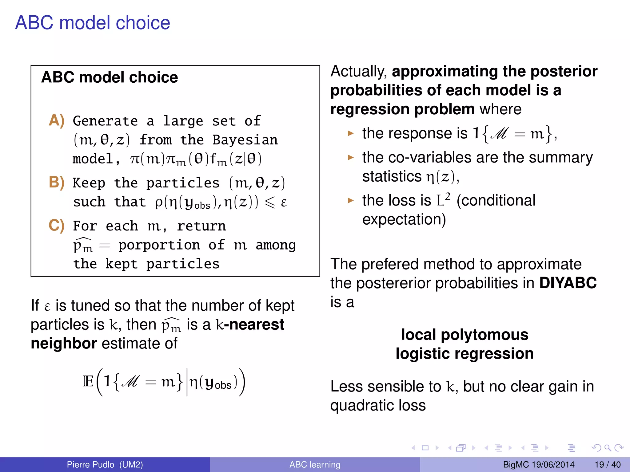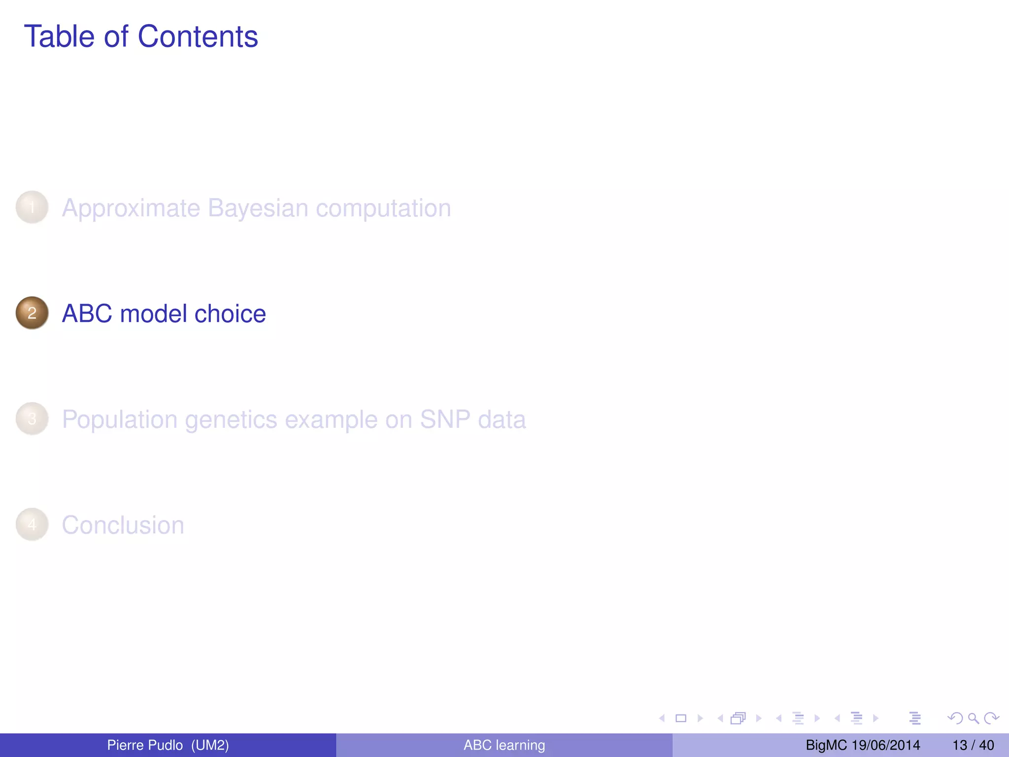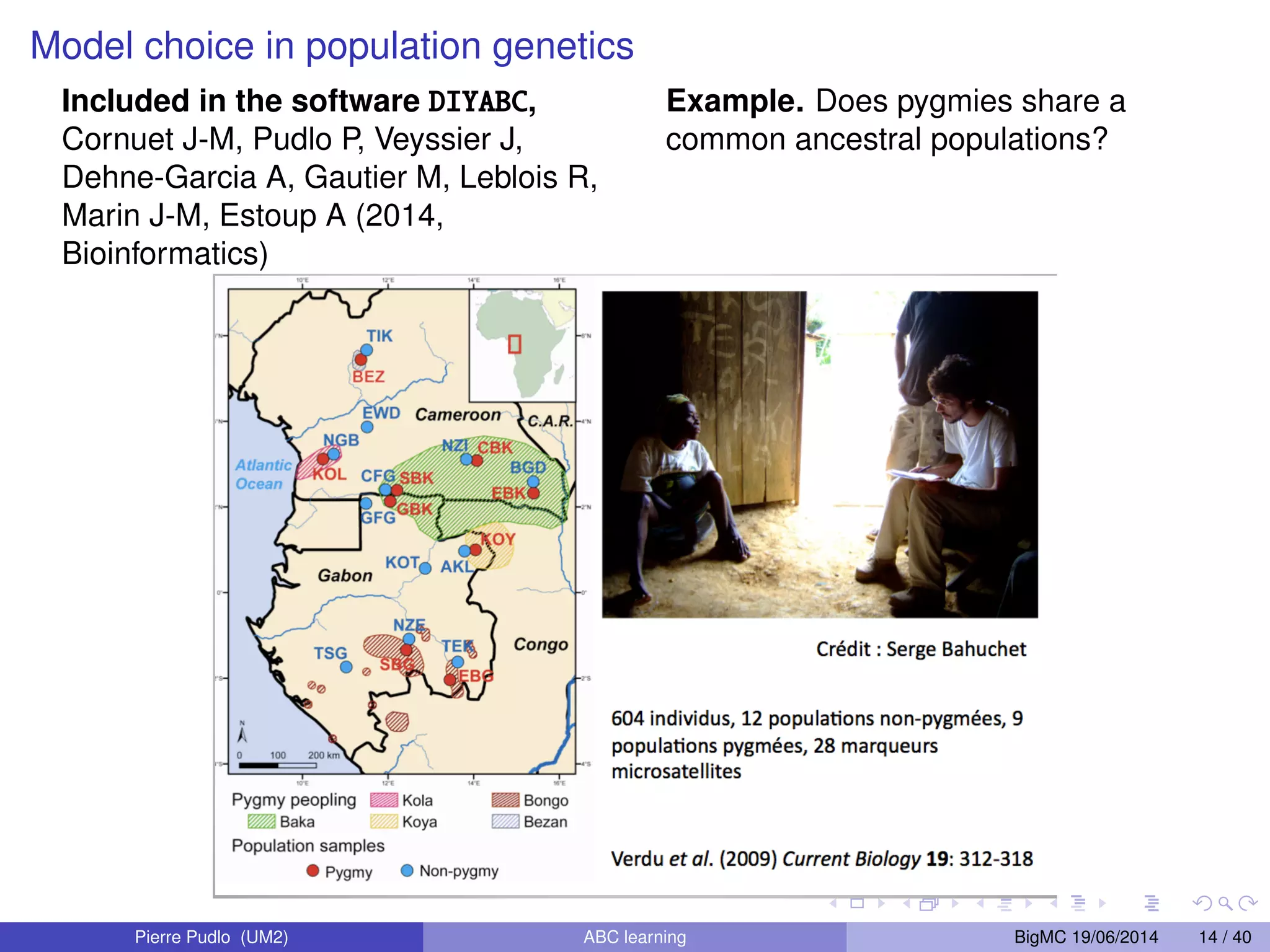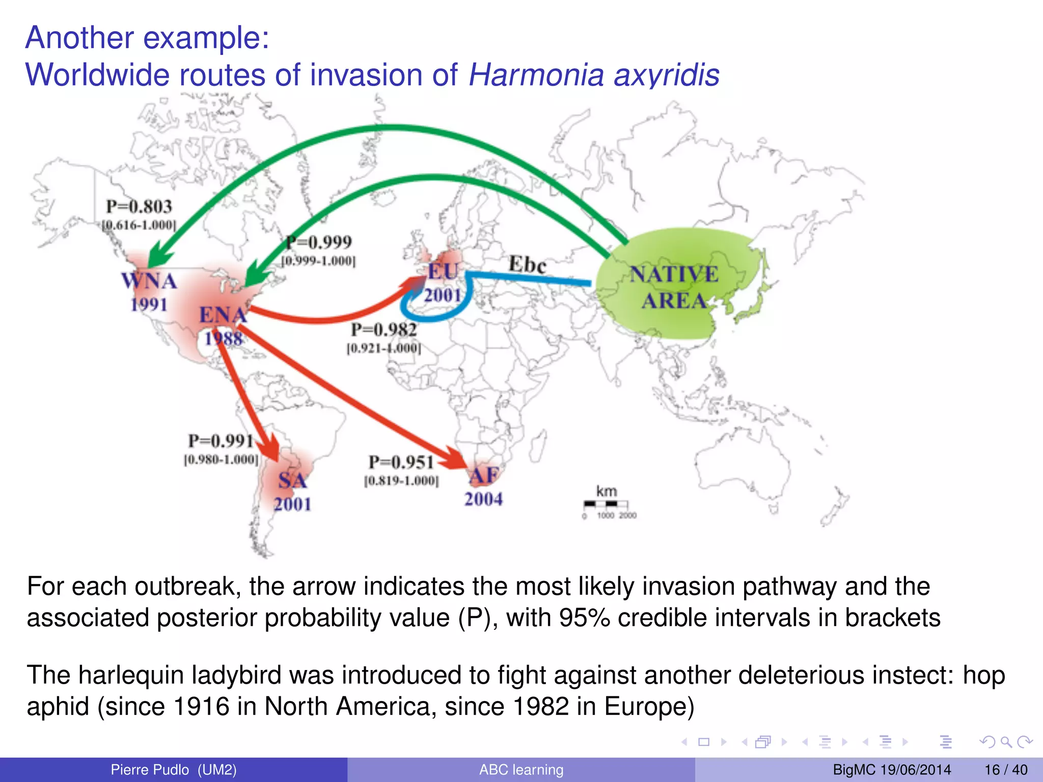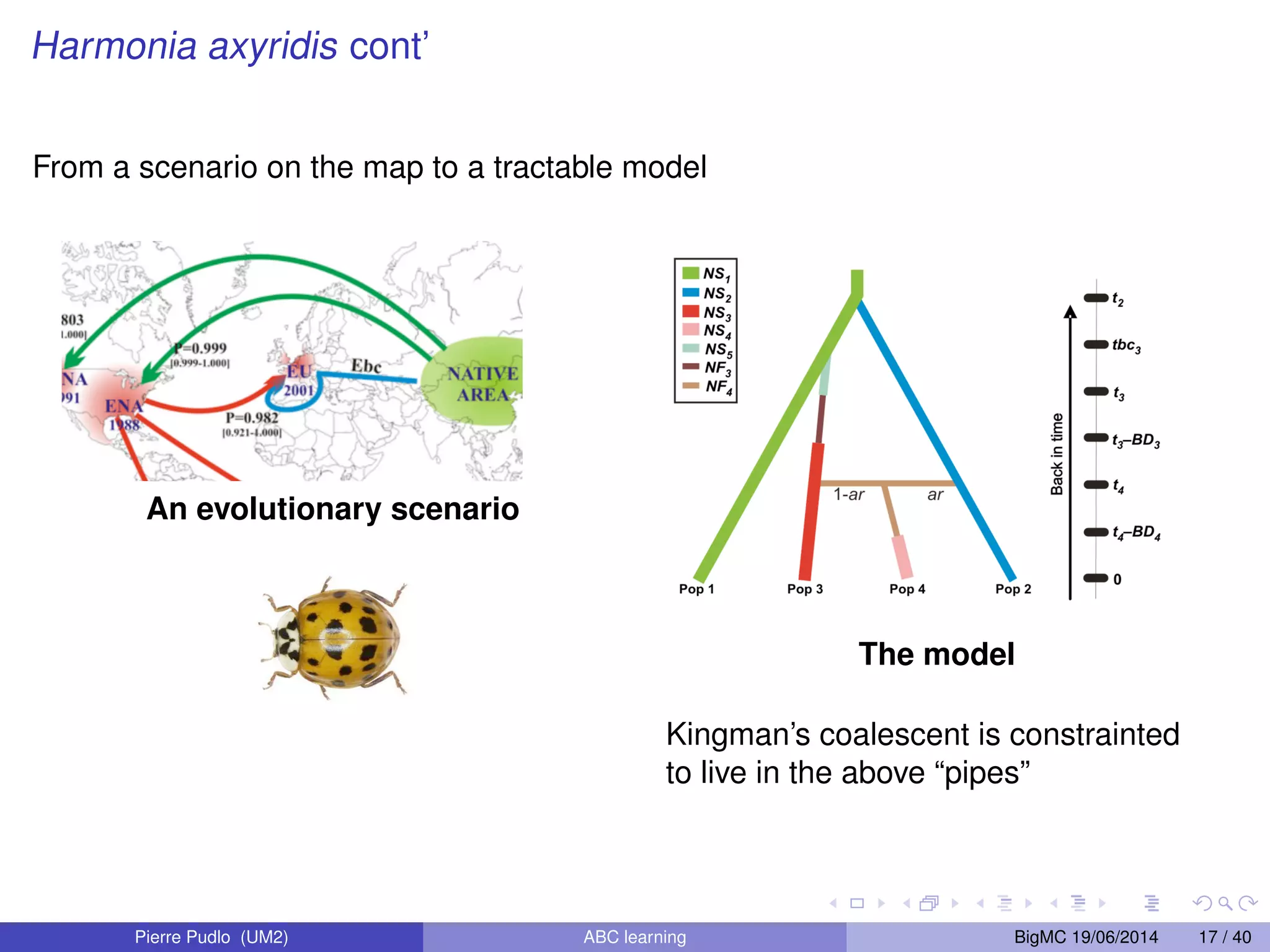 The document discusses Approximate Bayesian Computation (ABC), particularly in the context of population genetics, where it is used to infer demographic models from genetic data without needing to calculate likelihood functions. It details the methodology of ABC, including model choice and the use of genetic data for understanding population scenarios. The document highlights various examples of applications, including the study of the Asian ladybird's invasion routes and methods to analyze demographic models through ABC techniques.