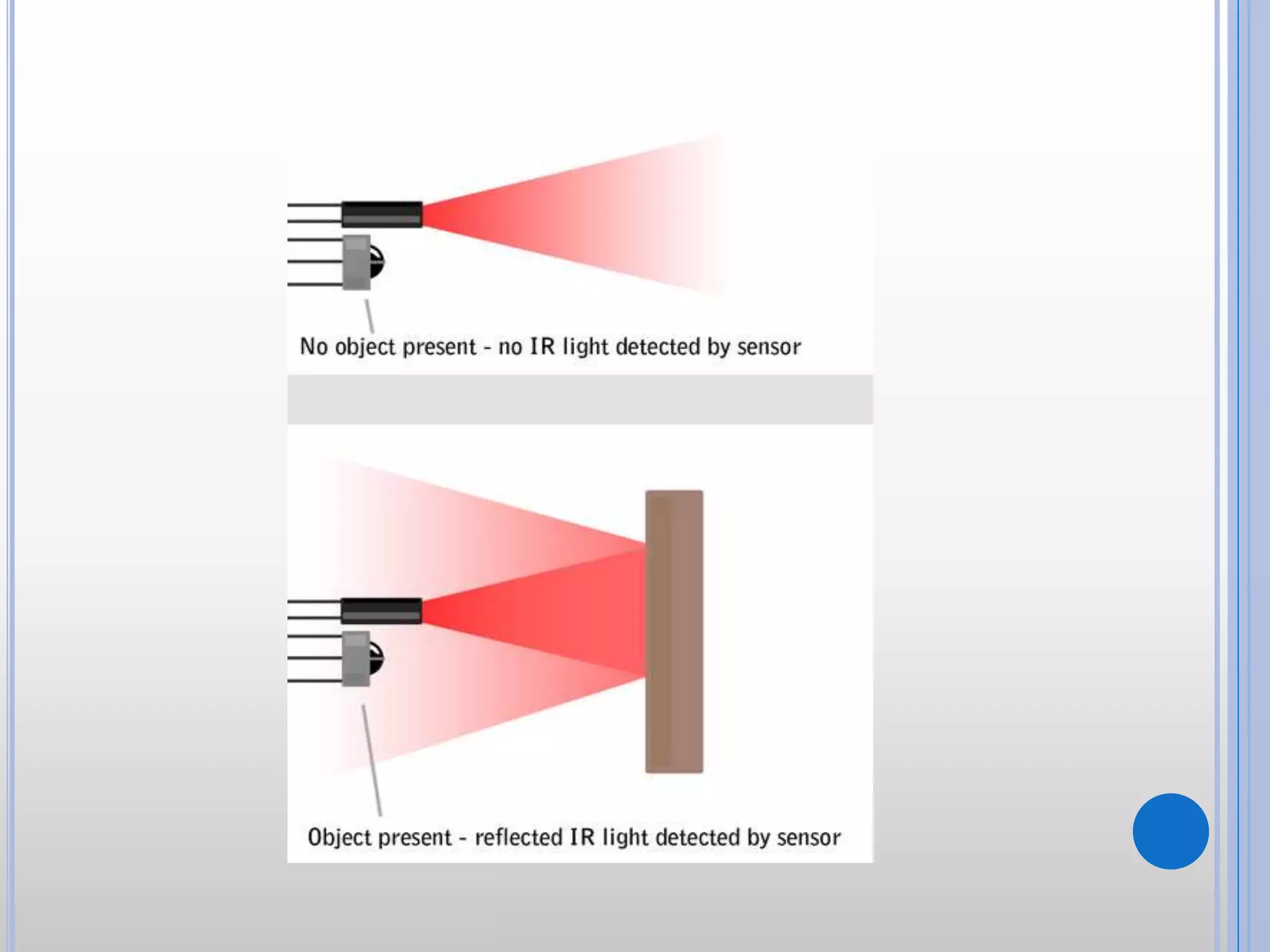 IR SENSOR Aninfrared sensor emits and/or detects infrared radiation to sense its surroundings. IR Transmitter: Infrared transmitter is a light emitting diode (LED) which emits infrared radiations. Hence, they are called IR LED’s. Receiver: Infrared receivers detect the radiation from an IR transmitter. Working principle: Reflection by an object.