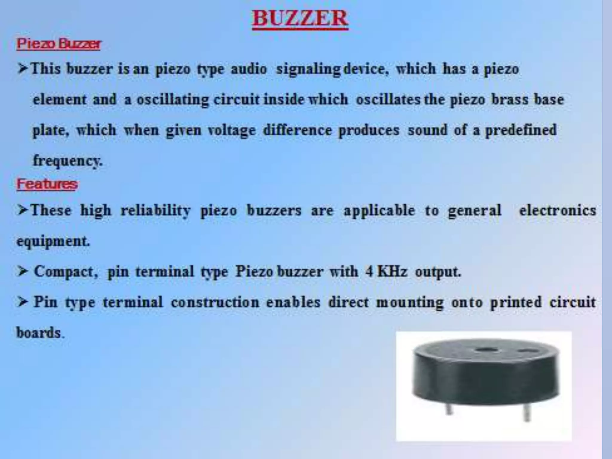 SIMPLE PROGRAM int buzz= 2; Void setup(){ pinMode(buzz,OUTPUT); } Void loop(){ digitalWrite(2,HIGH); delay(1000); digitalWrite(2,LOW); delay(1000); }