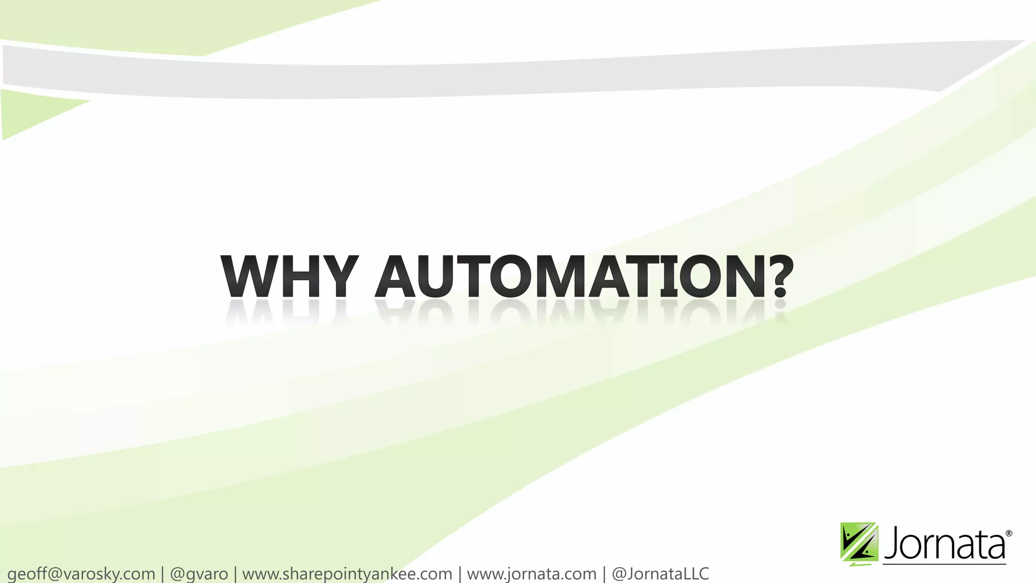 Geoff Varosky presented on automating enterprise application deployments with PowerShell. PowerShell allows automating environment and application deployments through scripting. It provides advantages like human-less deployments and repeatable processes. Examples of automation include farm configuration, service applications, and solution deployments. Documentation and shared functions help refine automated deployments over time.