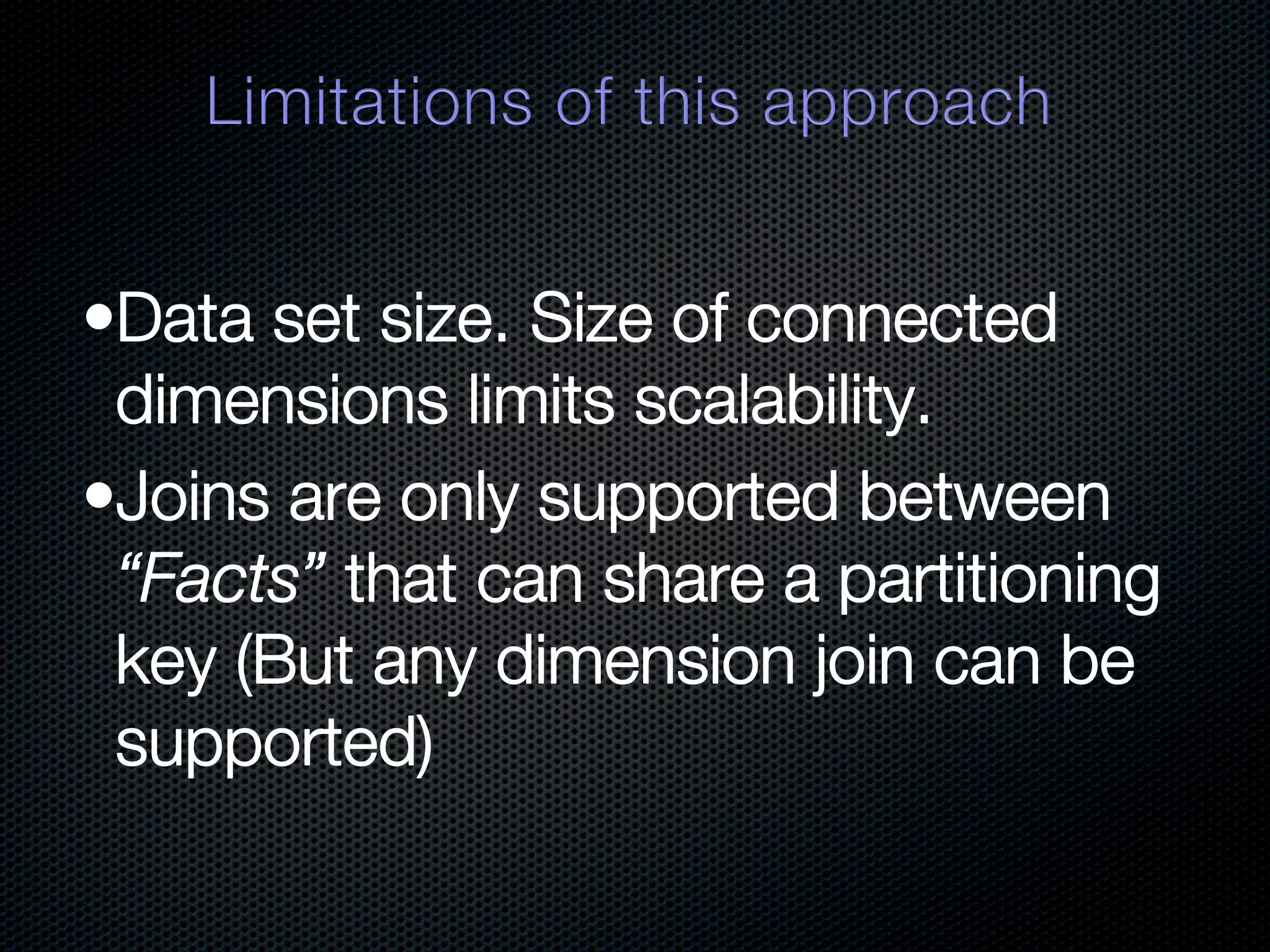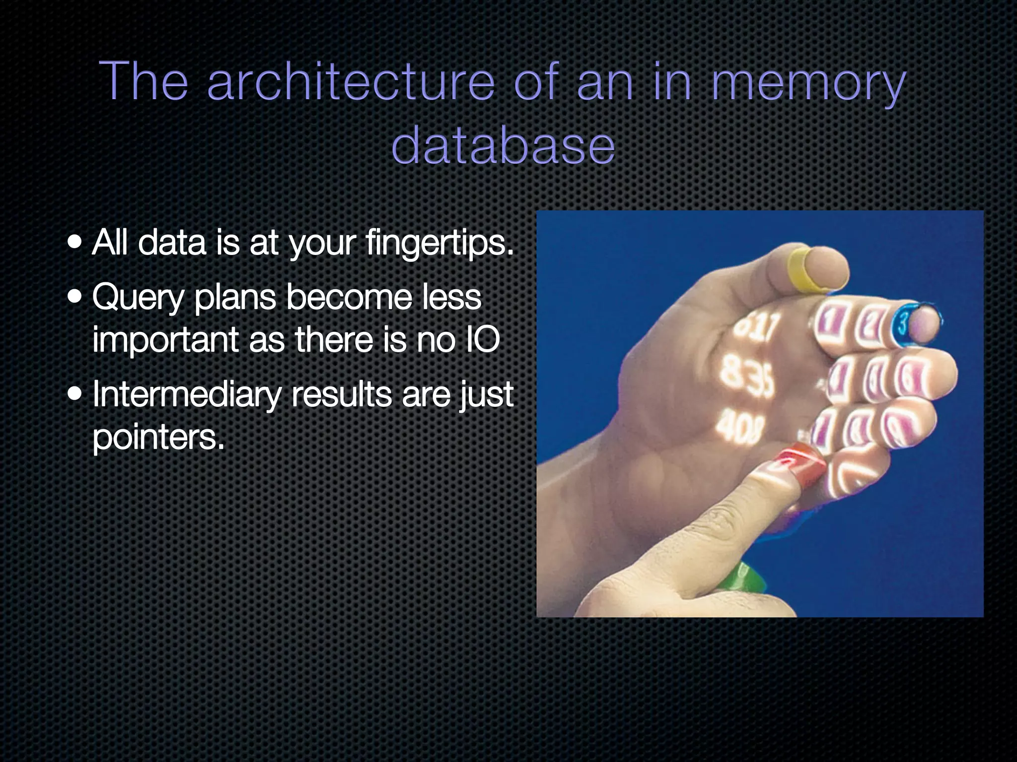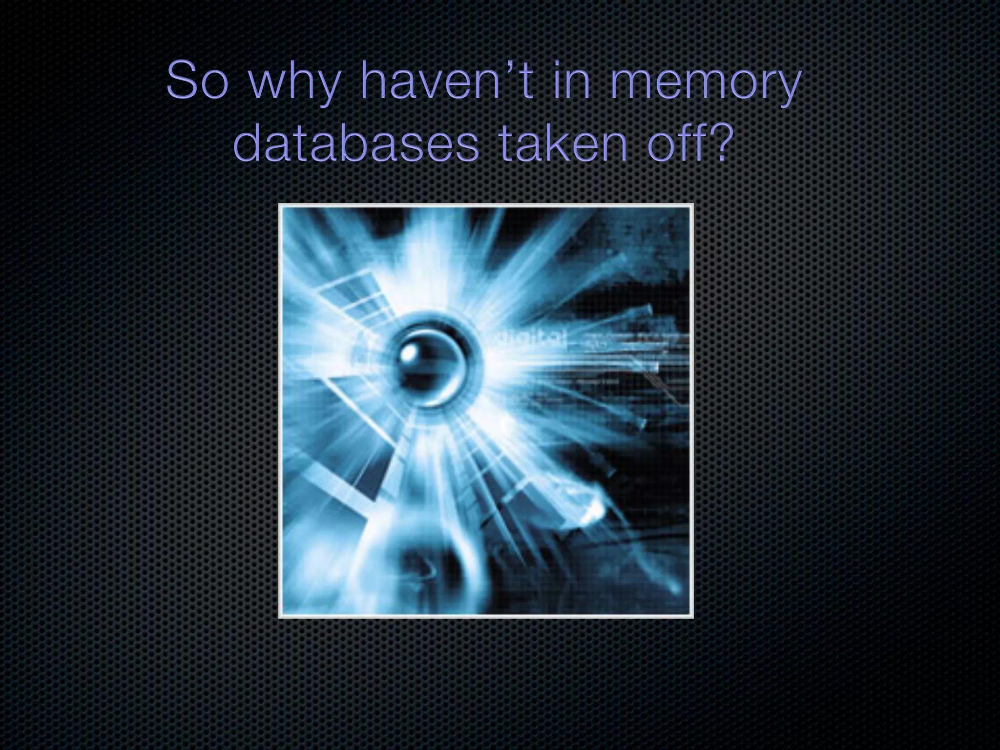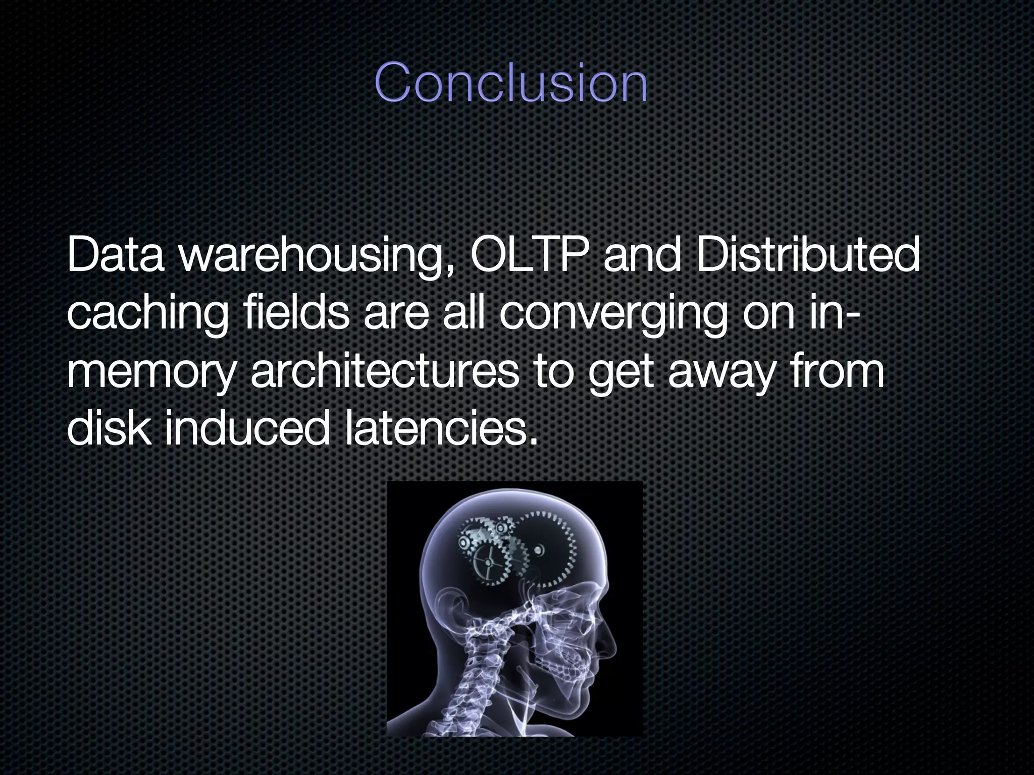 In-memory databases enhance performance but face challenges with data durability and complexity due to traditional disk-based architectures. The document discusses how techniques like partitioning and connected replication can alleviate issues related to joins across distributed systems while maintaining efficient data access. It emphasizes the use of snowflake schemas and caching strategies to optimize data processing in a multi-node environment.